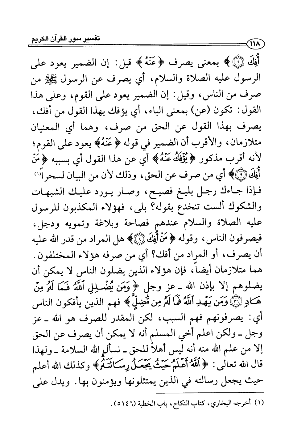 أفك} بمعنى يصرف {عنه} قيل: إن الضمير يعود على الرسول عليه الصلاة والسلام، أي يصرف عن الرسول صلى الله عليه وسلم من صرف من الناس، وقيل: إن الضمير يعود على القوم، وعلى هذا القول: تكون (عن) بمعنى الباء، أي يؤفك بهذا القول من أفك، يصرف بهذا القول عن الحق من صرف، وهما أي المعنيان متلازمان، والأقرب أن الضمير في قوله {عنه} يعود على القوم؛ لأنه أقرب مذكور {يؤفك عنه} أي عن هذا القول أي بسببه {من أفك} أي من صرف عن الحق، وذلك لأن من البيان لسحراً (¬١) فإذا جاءك رجل بليغ فصيح، وصار يورد عليك الشبهات والشكوك ألست تنخدع بقوله؟ بلى، فهؤلاء المكذبون للرسول عليه الصلاة والسلام عندهم فصاحة وبلاغة وتمويه ودجل، فيصرفون الناس، وقوله {من أفك} هل المراد من قدر الله عليه أن يصرف، أو المراد من أفك؟ أي من صرفه هؤلاء المختلفون.