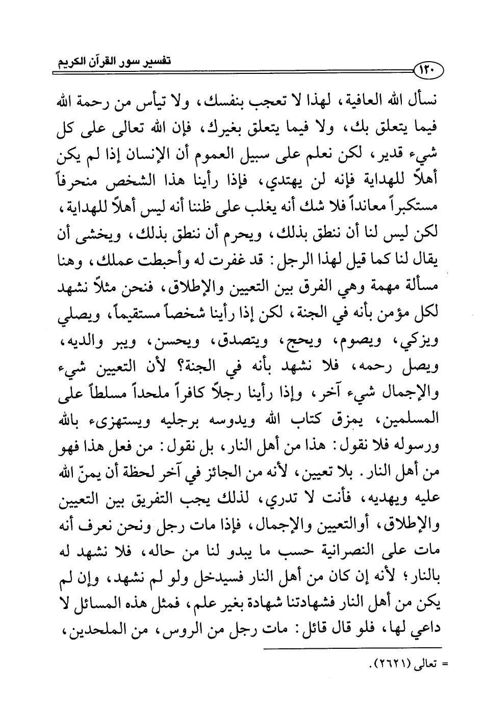 بلا تعيين، لأنه من الجائز في آخر لحظة أن يمنّ الله عليه ويهديه، فأنت لا تدري، لذلك يجب التفريق بين التعيين والإطلاق، أوالتعيين والإجمال، فإذا مات رجل ونحن نعرف أنه مات على النصرانية حسب ما يبدو لنا من حاله، فلا نشهد له بالنار؛ لأنه إن كان من أهل النار فسيدخل ولو لم نشهد، وإن لم يكن من أهل النار فشهادتنا شهادة بغير علم، فمثل هذه المسائل لا داعي لها، فلو قال قائل: مات رجل من الروس، من الملحدين،