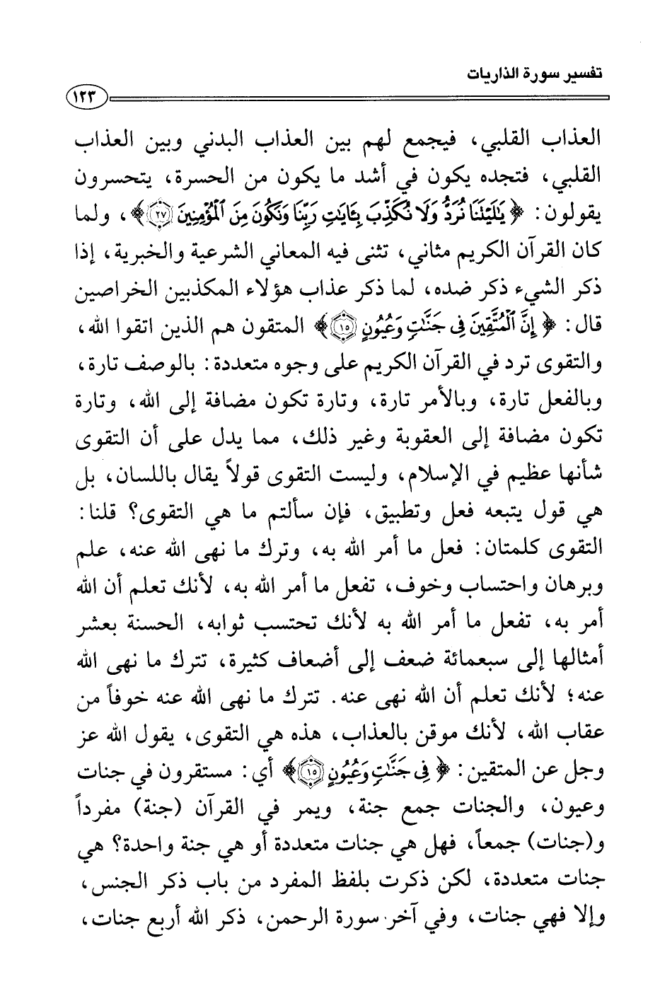 ولما كان القرآن الكريم مثاني، تثنى فيه المعاني الشرعية والخبرية، إذا ذكر الشيء ذكر ضده، لما ذكر عذاب هؤلاء المكذبين الخراصين قال: {إن المتقين في جنات وعيون} المتقون هم الذين اتقوا الله، والتقوى ترد في القرآن الكريم على وجوه متعددة: بالوصف تارة، وبالفعل تارة، وبالأمر تارة، وتارة تكون مضافة إلى الله، وتارة تكون مضافة إلى العقوبة وغير ذلك، مما يدل على أن التقوى شأنها عظيم في الإسلام، وليست التقوى قولاً يقال باللسان، بل هي قول يتبعه فعل وتطبيق، فإن سألتم ما هي التقوى؟ قلنا: التقوى كلمتان: فعل ما أمر الله به، وترك ما نهى الله عنه، علم وبرهان واحتساب وخوف، تفعل ما أمر الله به، لأنك تعلم أن الله أمر به، تفعل ما أمر الله به لأنك تحتسب ثوابه، الحسنة بعشر أمثالها إلى سبعمائة ضعف إلى أضعاف كثيرة، تترك ما نهى الله عنه؛ لأنك تعلم أن الله نهى عنه. تترك ما نهى الله عنه خوفاً من عقاب الله، لأنك موقن بالعذاب، هذه هي التقوى، يقول الله عز وجل عن المتقين: {في جنات وعيون} أي: مستقرون في جنات وعيون، والجنات جمع جنة، ويمر في القرآن (جنة) مفرداً و (جنات) جمعاً، فهل هي جنات متعددة أو هي جنة واحدة؟ هي جنات متعددة، لكن ذكرت بلفظ المفرد من باب ذكر الجنس، وإلا فهي جنات، وفي آخر سورة الرحمن، ذكر الله أربع جنات،