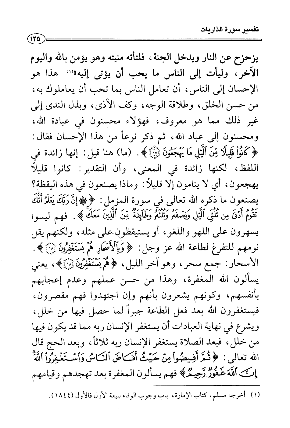 يزحزح عن النار ويدخل الجنة، فلتأته منيته وهو يؤمن بالله واليوم الآخر، وليأت إلى الناس ما يحب أن يؤتى إليه» (¬١) هذا هو الإحسان إلى الناس، أن تعامل الناس بما تحب أن يعاملوك به، من حسن الخلق، وطلاقة الوجه، وكف الأذى، وبذل الندى إلى غير ذلك مما هو معروف، فهؤلاء محسنون في عبادة الله، ومحسنون إلى عباد الله، ثم ذكر نوعاً من هذا الإحسان فقال: {كانوا قليلاً من الليل ما يهجعون} . (ما) هنا قيل: إنها زائدة في اللفظ، لكنها زائدة في المعنى، وأن التقدير: كانوا قليلاً يهجعون، أي لا ينامون إلا قليلاً: وماذا يصنعون في هذه اليقظة؟ يصنعون ما ذكره الله تعالى في سورة المزمل: {إن ربك يعلم أنك تقوم أدنى من ثلثى الليل ونصفه وثلثه وطآئفة من الذين معك} . فهم ليسوا يسهرون على اللهو واللغو، أو يستيقظون على مثله، ولكنهم يقل نومهم للتفرغ لطاعة الله عز وجل: {وبالأَسحار هم يستغفرون} .