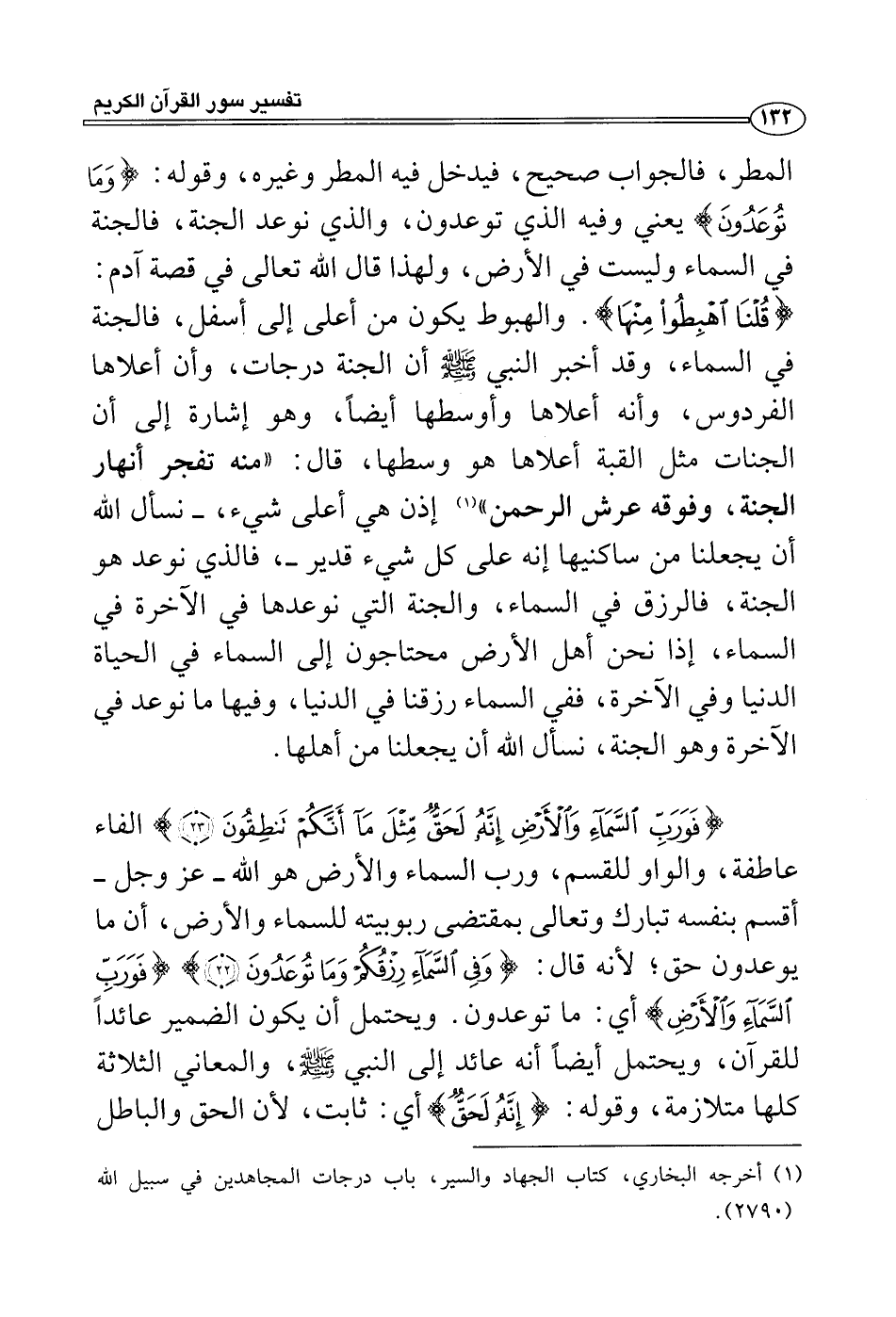 المطر، فالجواب صحيح، فيدخل فيه المطر وغيره، وقوله: {وما توعدون} يعني وفيه الذي توعدون، والذي نوعد الجنة، فالجنة في السماء وليست في الأرض، ولهذا قال الله تعالى في قصة آدم: {قلنا اهبطوا منها} . والهبوط يكون من أعلى إلى أسفل، فالجنة في السماء، وقد أخبر النبي صلى الله عليه وسلم أن الجنة درجات، وأن أعلاها الفردوس، وأنه أعلاها وأوسطها أيضاً، وهو إشارة إلى أن الجنات مثل القبة أعلاها هو وسطها، قال: «منه تفجر أنهار الجنة، وفوقه عرش الرحمن» (¬١) إذن هي أعلى شيء، - نسأل الله أن يجعلنا من ساكنيها إنه على كل شيء قدير -، فالذي نوعد هو الجنة، فالرزق في السماء، والجنة التي نوعدها في الآخرة في السماء، إذا نحن أهل الأرض محتاجون إلى السماء في الحياة الدنيا وفي الآخرة، ففي السماء رزقنا في الدنيا، وفيها ما نوعد في الآخرة وهو الجنة، نسأل الله أن يجعلنا من أهلها.