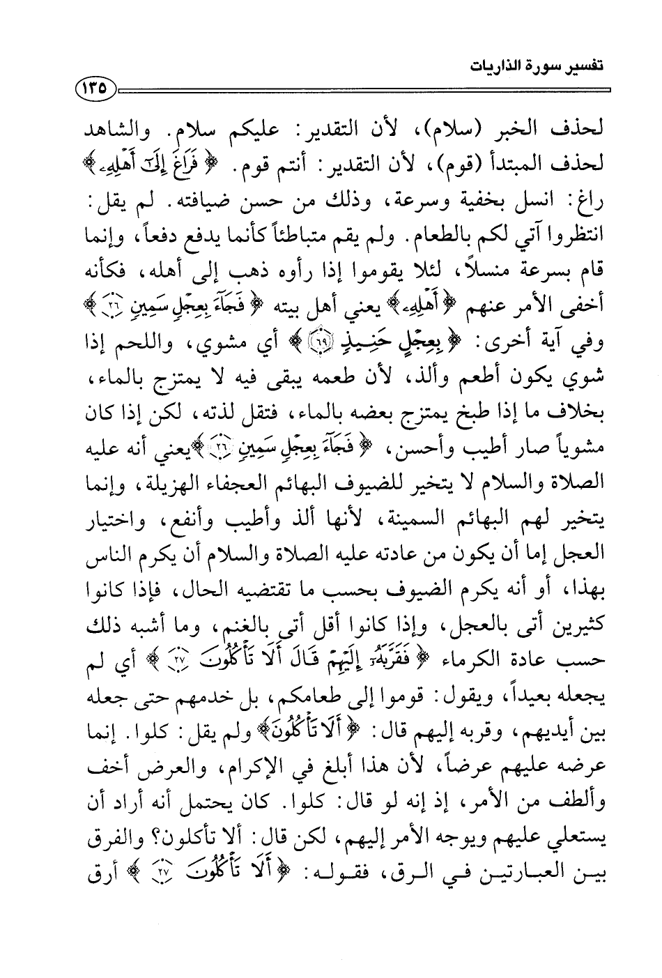 ولم يقم متباطئاً كأنما يدفع دفعاً، وإنما قام بسرعة منسلاً، لئلا يقوموا إذا رأوه ذهب إلى أهله، فكأنه أخفى الأمر عنهم {أهله} يعني أهل بيته {فجاء بعجل سمين} وفي آية أخرى: {بعجل حنيذ} أي مشوي، واللحم إذا شوي يكون أطعم وألذ، لأن طعمه يبقى فيه لا يمتزج بالماء، بخلاف ما إذا طبخ يمتزج بعضه بالماء، فتقل لذته، لكن إذا كان مشوياً صار أطيب وأحسن، {فجاء بعجل سمين} يعني أنه عليه الصلاة والسلام لا يتخير للضيوف البهائم العجفاء الهزيلة، وإنما يتخير لهم البهائم السمينة، لأنها ألذ وأطيب وأنفع، واختيار العجل إما أن يكون من عادته عليه الصلاة والسلام أن يكرم الناس بهذا، أو أنه يكرم الضيوف بحسب ما تقتضيه الحال، فإذا كانوا كثيرين أتى بالعجل، وإذا كانوا أقل أتى بالغنم، وما أشبه ذلك حسب عادة الكرماء {فقربه إليهم قال ألا تأكلون} أي لم يجعله بعيداً، ويقول: قوموا إلى طعامكم، بل خدمهم حتى جعله بين أيديهم، وقربه إليهم قال: {ألا تأكلون} ولم يقل: كلوا. إنما عرضه عليهم عرضاً، لأن هذا أبلغ في الإكرام، والعرض أخف وألطف من الأمر، إذ إنه لو قال: كلوا. كان يحتمل أنه أراد أن يستعلي عليهم ويوجه الأمر إليهم، لكن قال: ألا تأكلون؟ والفرق بين العبارتين في الرق، فقوله: {ألا تأكلون} أرق