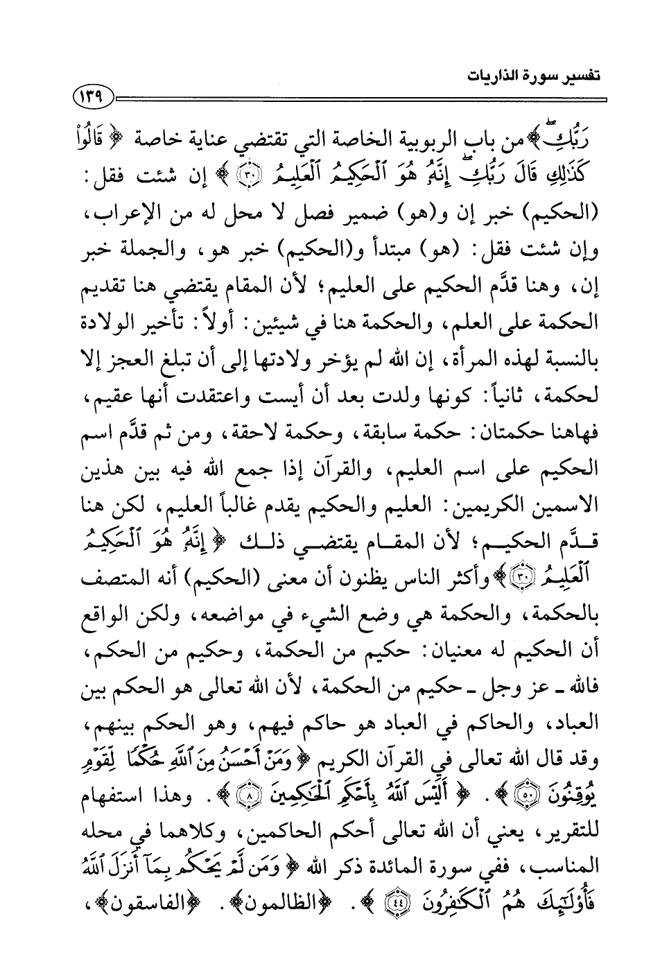 ربك} من باب الربوبية الخاصة التي تقتضي عناية خاصة {قالوا كذلك قال ربك إنه هو الحكيم العليم} إن شئت فقل: (الحكيم) خبر إن و (هو) ضمير فصل لا محل له من الإعراب، وإن شئت فقل: (هو) مبتدأ و (الحكيم) خبر هو، والجملة خبر إن، وهنا قدَّم الحكيم على العليم؛ لأن المقام يقتضي هنا تقديم الحكمة على العلم، والحكمة هنا في شيئين: أولاً: تأخير الولادة بالنسبة لهذه المرأة، إن الله لم يؤخر ولادتها إلى أن تبلغ العجز إلا لحكمة، ثانياً: كونها ولدت بعد أن أيست واعتقدت أنها عقيم، فهاهنا حكمتان: حكمة سابقة، وحكمة لاحقة، ومن ثم قدَّم اسم الحكيم على اسم العليم، والقرآن إذا جمع الله فيه بين هذين الاسمين الكريمين: العليم والحكيم يقدم غالباً العليم، لكن هنا قدَّم الحكيم؛ لأن المقام يقتضي ذلك {إنه هو الحكيم العليم} وأكثر الناس يظنون أن معنى (الحكيم) أنه المتصف بالحكمة، والحكمة هي وضع الشيء في مواضعه، ولكن الواقع أن