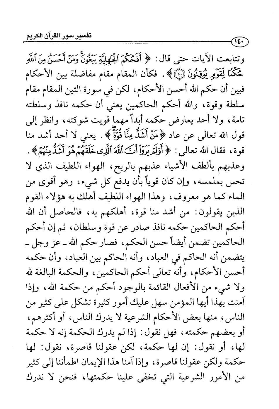وتتابعت الآيات حتى قال: {أفحكم الجاهلية يبغون ومن أحسن من الله حكماً لقوم يوقنون} . فكأن المقام مقام مفاضلة بين الأحكام فبين أن حكم الله أحسن الأحكام، لكن في سورة التين المقام مقام سلطة وقوة، والله أحكم الحاكمين يعني أن حكمه نافذ وسلطته تامة، ولا أحد يعارض حكمه أبداً مهما قويت شوكته، وانظر إلى قول الله تعالى عن عاد {من أشد منا قوةً} . يعني لا أحد أشد منا قوة، فقال الله تعالى: {أولم يروا أن الله الذي خلقهم هو أشد منهم} .