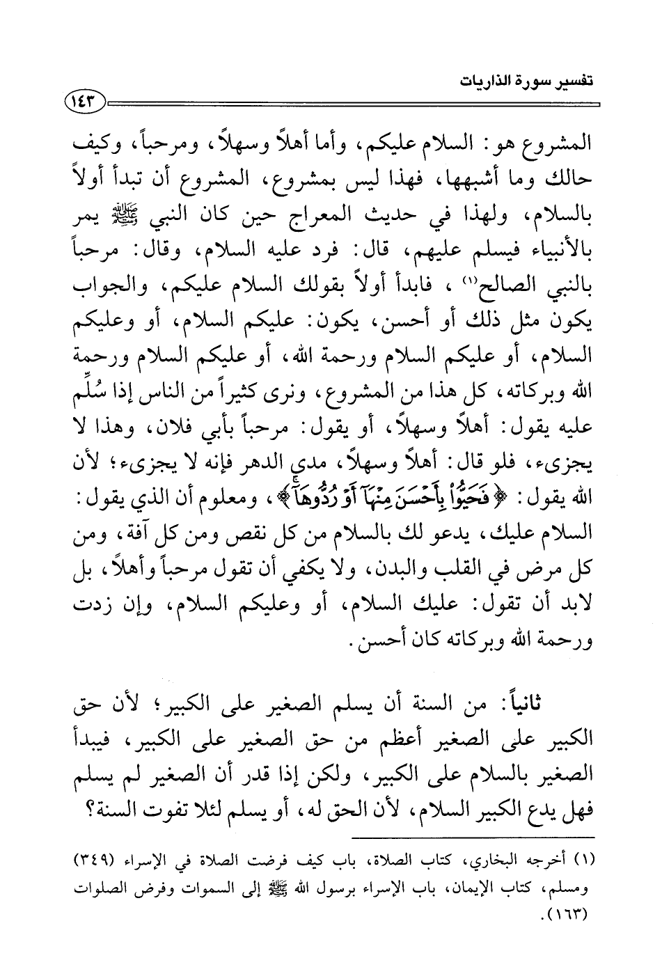 ثانياً: من السنة أن يسلم الصغير على الكبير؛ لأن حق الكبير على الصغير أعظم من حق الصغير على الكبير، فيبدأ الصغير بالسلام على الكبير، ولكن إذا قدر أن الصغير لم يسلم فهل يدع الكبير السلام، لأن الحق له، أو يسلم لئلا تفوت السنة؟