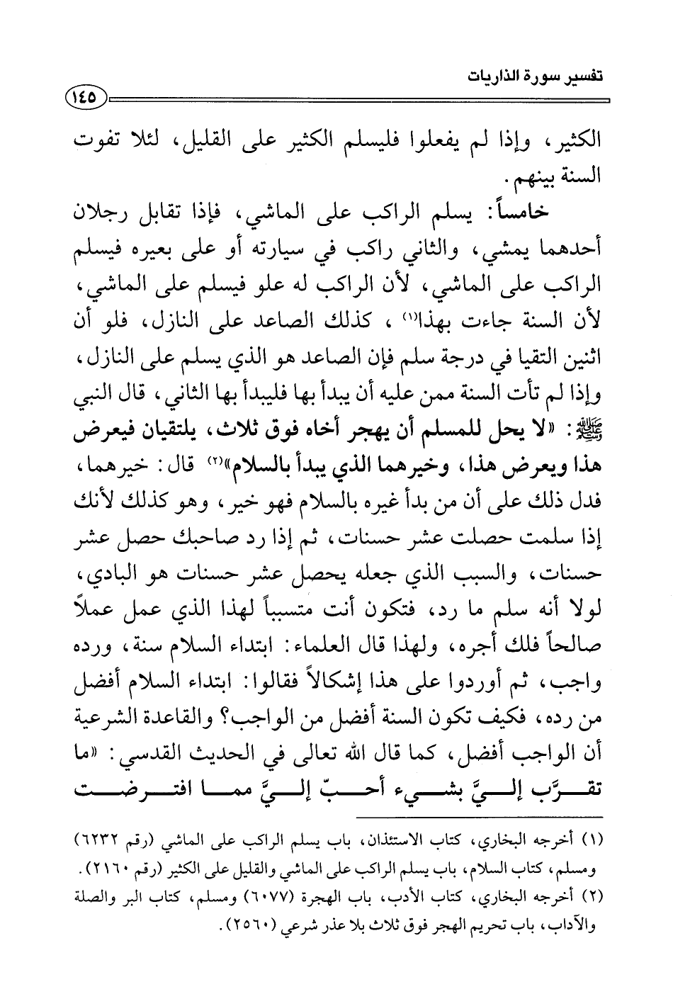(¬١) أخرجه البخاري، كتاب الاستئذان، باب يسلم الراكب على الماشي (رقم ٦٢٣٢) ومسلم، كتاب السلام، باب يسلم الراكب على الماشي والقليل على الكثير (رقم ٢١٦٠) .