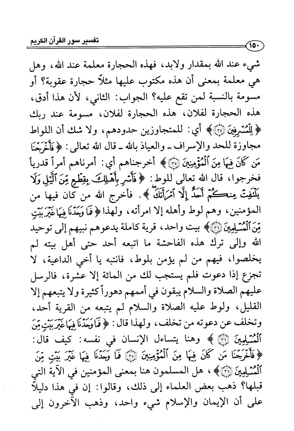 فأخرج الله من كان فيها من المؤمنين، وهم لوط وأهله إلا امرأته، ولهذا {فما وجدنا فيها غير بيت من المسلمين} بيت واحد، قرية كاملة يدعوهم نبيهم إلى توحيد الله وإلى ترك هذه الفاحشة ما اتبعه أحد حتى أهل بيته لم يخلصوا، فيهم من لم يؤمن بلوط، فانتبه يا أخي الداعية، لا تجزع إذا دعوت فلم يستجب لك من المائة إلا عشرة، فالرسل عليهم الصلاة والسلام يبقون في أممهم دهوراً كثيرة ولا يتبعهم إلا القليل، ولوط عليه الصلاة والسلام لم يتبعه من القرية أحد، وتخلف عن دعوته من تخلف، ولهذا قال: {فما وجدنا فيها غير بيت من المسلمين} وهنا يتساءل الإنسان في نفسه: كيف قال: {فأخرجنا من كان فيها من المؤمنين فما وجدنا فيها غير بيت من المسلمين} ، هل المسلمون هنا بمعنى المؤمنين في الآية التي قبلها؟ ذهب بعض العلماء إلى ذلك، وقالوا: إن في هذا دليلاً على أن الإيمان والإسلام شيء واحد، وذهب الآخرون إلى