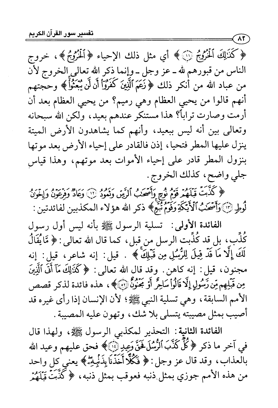 الفائدة الأولى: تسلية الرسول صلى الله عليه وسلم بأنه ليس أول رسول كُذِّب، بل قد كُذِّبت الرسل من قبل، كما قال الله تعالى: {ما يقال لك إلا ما قد قيل للرسل من قبلك} . قيل: إنه شاعر، قيل: إنه مجنون، قيل: إنه كاهن. وقد قال الله تعالى: {كذلك مآ أتى الذين من قبلهم من رسول إلا قالوا ساحر أو مجنون} ، هذه فائدة لذكر قصص الأمم السابقة، وهي تسلية النبي صلى الله عليه وسلم؛ لأن الإنسان إذا رأى غيره قد أصيب بمثل مصيبته يتسلى بلا شك، وتهون عليه المصيبة.