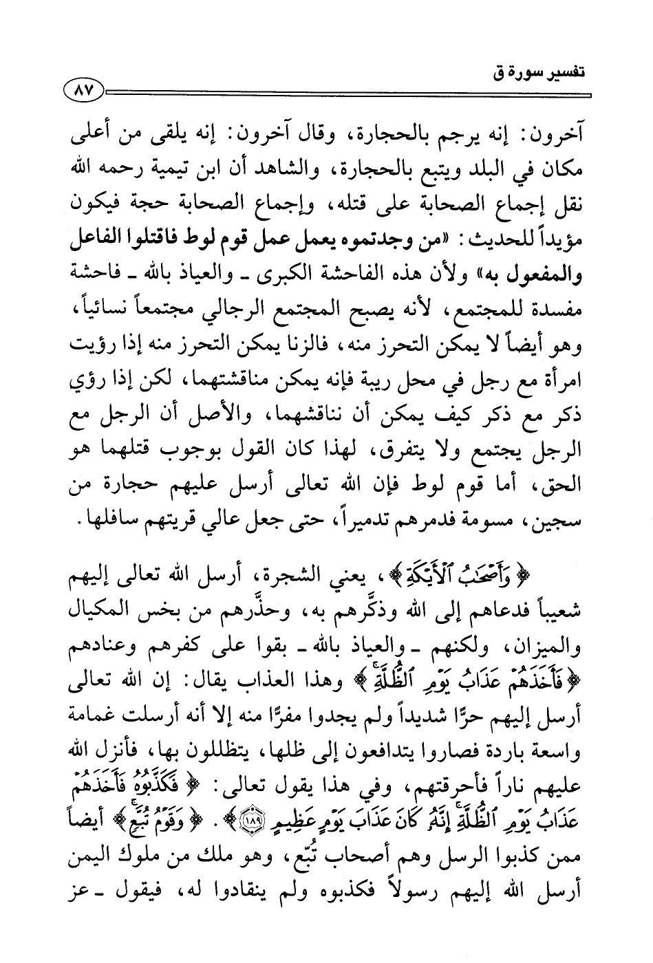 {وأصحاب الأَيكة} ، يعني الشجرة، أرسل الله تعالى إليهم شعيباً فدعاهم إلى الله وذكَّرهم به، وحذَّرهم من بخس المكيال والميزان، ولكنهم - والعياذ بالله - بقوا على كفرهم وعنادهم {فأخذهم عذاب يوم الظلة} وهذا العذاب يقال: إن الله تعالى أرسل إليهم حرًّا شديداً ولم يجدوا مفرًّا منه إلا أنه أرسلت غمامة واسعة باردة فصاروا يتدافعون إلى ظلها، يتظللون بها، فأنزل الله عليهم ناراً فأحرقتهم، وفي هذا يقول تعالى: {فكذبوه فأخذهم عذاب يوم الظلة إنه كان عذاب يوم عظيم} . {وقوم تبع} أيضاً ممن كذبوا الرسل وهم أصحاب تُبّع، وهو ملك من ملوك اليمن أرسل الله إليهم رسولاً فكذبوه ولم ينقادوا له، فيقول - عز
