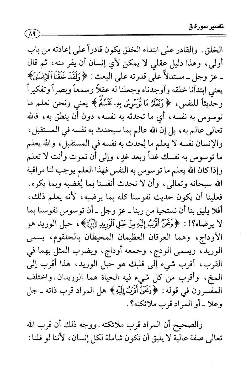 والقادر على ابتداء الخلق يكون قادراً على إعادته من باب أولى، وهذا دليل عقلي لا يمكن لأي إنسان أن يفر منه، ثم قال - عز وجل - مستدلاًّ على قدرته على البعث: {ولقد خلقنا الإنسان} يعني ابتدأنا خلقه وأوجدناه وجعلنا له عقلاً وسمعاً وبصراً وتفكيراً وحديثاً للنفس، {ونعلم ما توسوس به نفسه} يعني ونحن نعلم ما توسوس به نفسه، أي ما تحدثه به نفسه، دون أن ينطق به، فالله تعالى عالم به، بل إن الله عالم بما سيحدث به نفسه في المستقبل، والإنسان نفسه لا يعلم ما يُحدث به نفسه في المستقبل، والله يعلم ما توسوس به نفسك غداً وبعد غدٍ، وإلى أن تموت وأنت لا تعلم وإذا كان الله يعلم ما توسوس به النفس فهذا العلم يوجب لنا مراقبة الله سبحانه وتعالى، وأن لا نحدث أنفسنا بما يُغضبه وبما يكره. فعلينا أن يكون حديث نفوسنا كله بما يرضيه، لأنه يعلم ذلك، أفلا يليق بنا أن نستحيا من ربنا - عز وجل - أن توسوس نفوسنا بما لا يرضاه؟!: {ونحن أقرب إليه من حبل الوريد} ، حبل الوريد هو الأوداج، وهما العرقان العظيمان المحيطان بالحلقوم، يسمى الوريد، ويسمى الودج، وجمعه أوداج، ويضرب المثل بهما في القرب، أقرب شيء إلى قلبك هو حبل الوريد، هذا أقرب إلى المخ، وأقرب من كل شيء فيه الحياة هما الوريدان. واختلف المفسرون في قوله: {ونحن أقرب إليه} هل المراد قرب ذاته - جل وعلا - أو المراد قرب ملائكته؟.