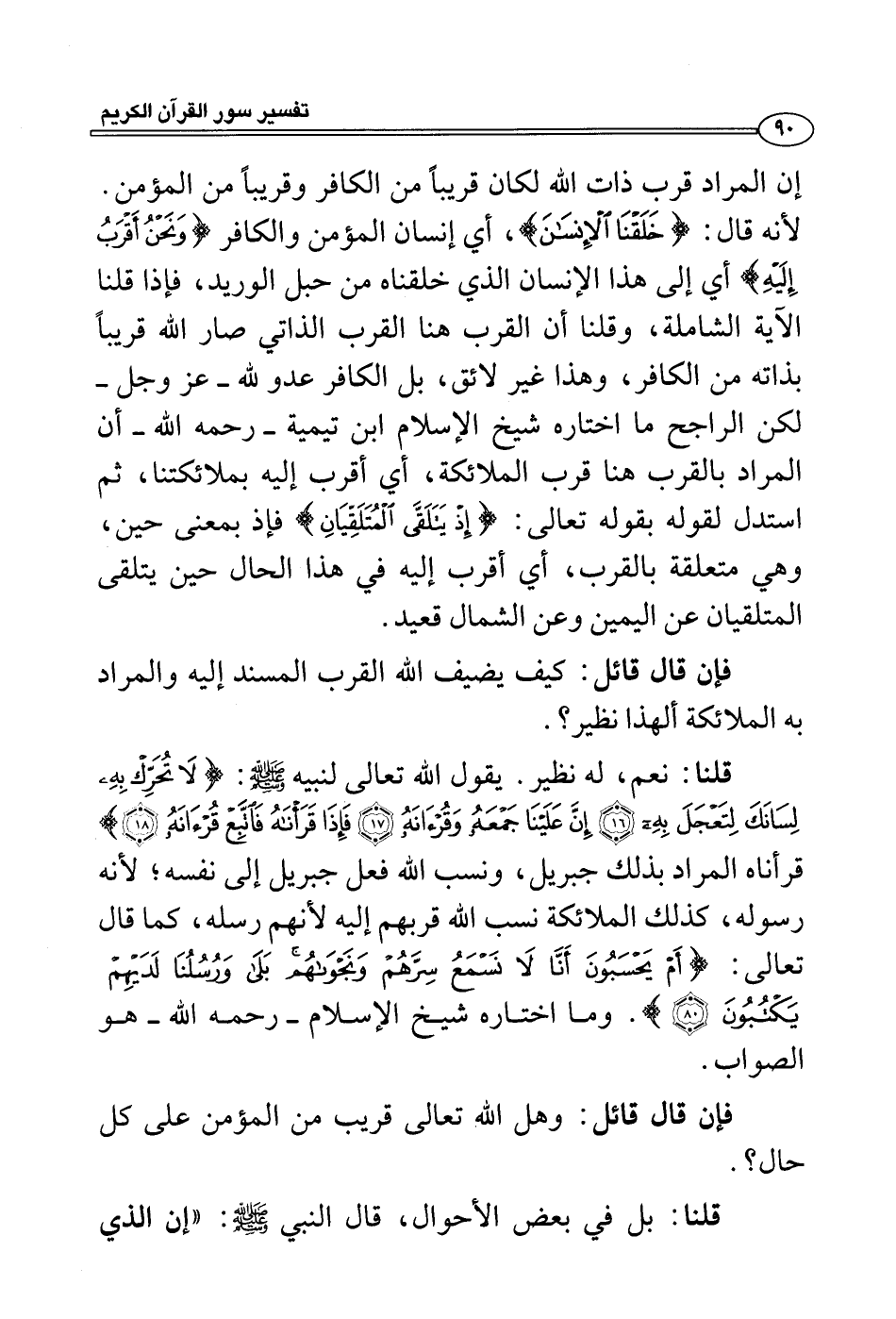 إن المراد قرب ذات الله لكان قريباً من الكافر وقريباً من المؤمن. لأنه قال: {خلقنا الإنسان} ، أي إنسان المؤمن والكافر {ونحن أقرب إليه} أي إلى هذا الإنسان الذي خلقناه من حبل الوريد، فإذا قلنا الآية الشاملة، وقلنا أن القرب هنا القرب الذاتي صار الله قريباً بذاته من الكافر، وهذا غير لائق، بل الكافر عدو لله - عز وجل - لكن الراجح ما اختاره شيخ الإسلام ابن تيمية - رحمه الله - أن المراد بالقرب هنا قرب الملائكة، أي أقرب إليه بملائكتنا، ثم استدل لقوله بقوله تعالى: {إذ يتلقى المتلقيان} فإذ بمعنى حين، وهي متعلقة بالقرب، أي أقرب إليه في هذا الحال حين يتلقى المتلقيان عن اليمين وعن الشمال قعيد.