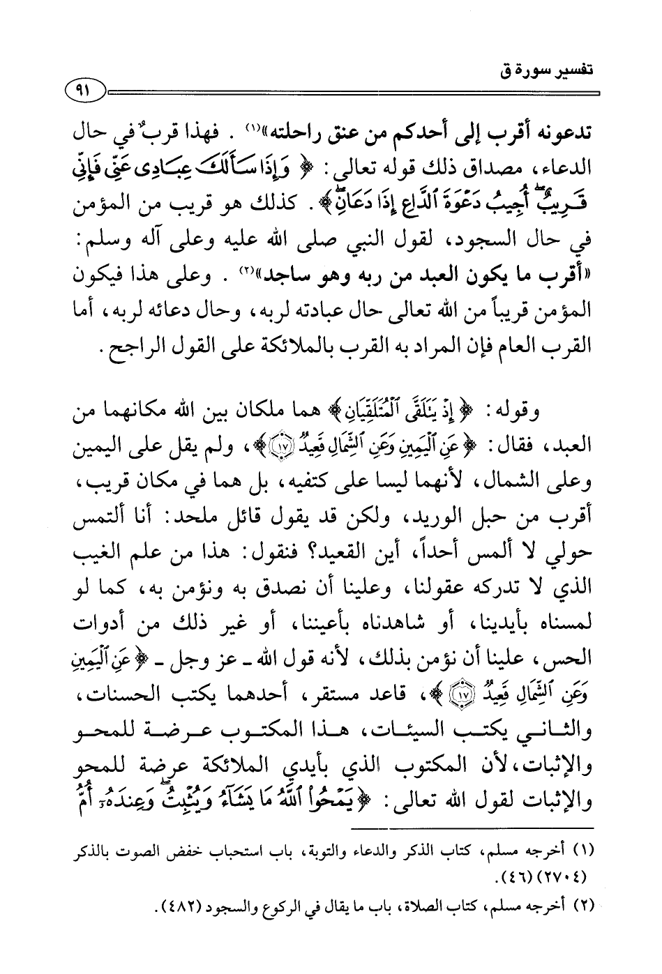 وقوله: {إذ يتلقى المتلقيان} هما ملكان بين الله مكانهما من العبد، فقال: {عن اليمين وعن الشمال قعيد} ، ولم يقل على اليمين وعلى الشمال، لأنهما ليسا على كتفيه، بل هما في مكان قريب، أقرب من حبل الوريد، ولكن قد يقول قائل ملحد: أنا ألتمس حولي لا ألمس أحداً، أين القعيد؟ فنقول: هذا من علم الغيب الذي لا تدركه عقولنا، وعلينا أن نصدق به ونؤمن به، كما لو لمسناه بأيدينا، أو شاهدناه بأعيننا، أو غير ذلك من أدوات الحس، علينا أن نؤمن بذلك، لأنه قول الله - عز وجل - {عن اليمين وعن الشمال قعيد} ، قاعد مستقر، أحدهما يكتب الحسنات، والثاني يكتب السيئات، هذا المكتوب عرضة للمحو والإثبات، لأن المكتوب الذي بأيدي الملائكة عرضة للمحو والإثبات لقول الله تعالى: {يمحو الله ما يشاء ويثبت وعنده أم
