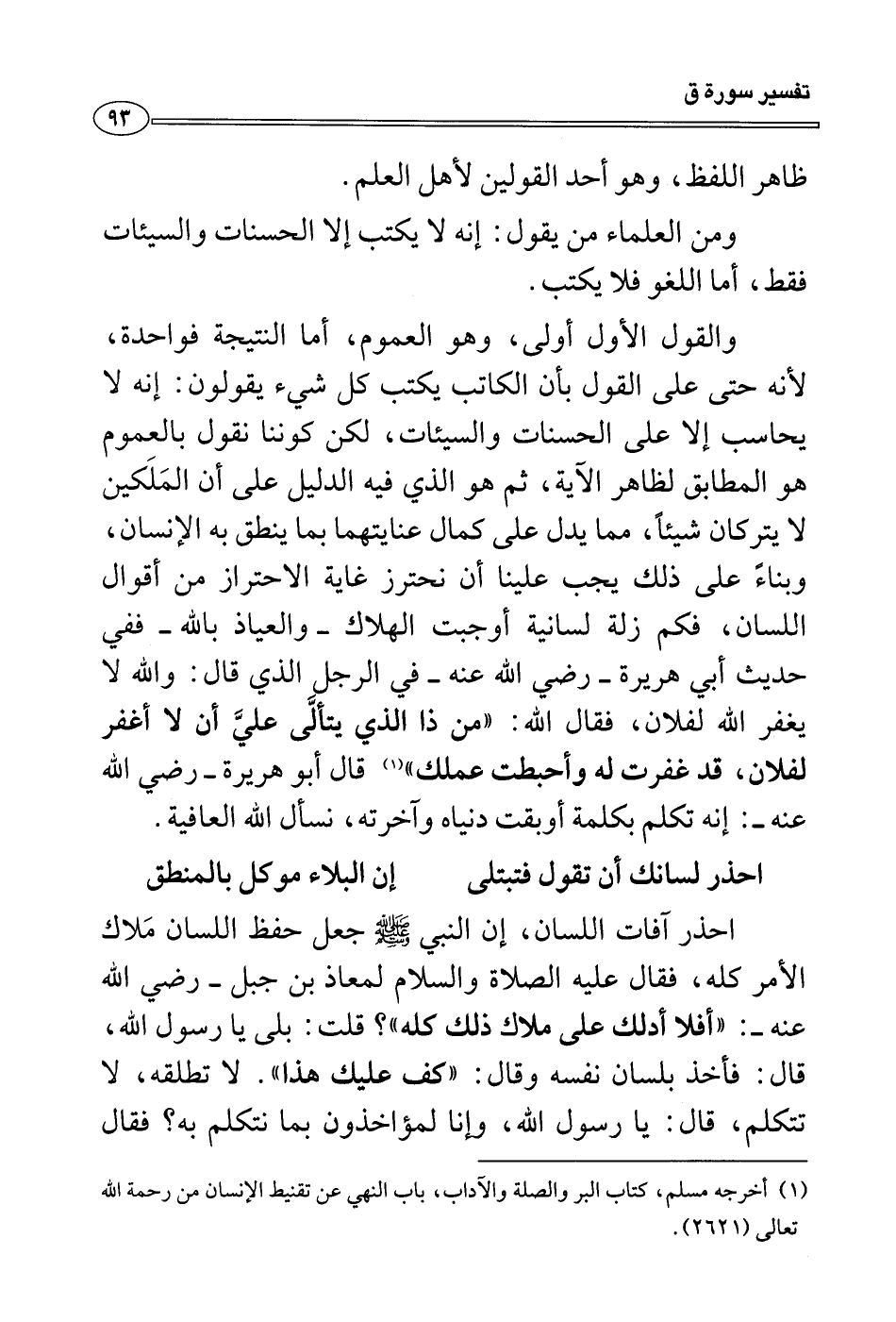 والقول الأول أولى، وهو العموم، أما النتيجة فواحدة، لأنه حتى على القول بأن الكاتب يكتب كل شيء يقولون: إنه لا يحاسب إلا على الحسنات والسيئات، لكن كوننا نقول بالعموم هو المطابق لظاهر الآية، ثم هو الذي فيه الدليل على أن المَلَكين لا يتركان شيئاً، مما يدل على كمال عنايتهما بما ينطق به الإنسان، وبناءً على ذلك يجب علينا أن نحترز غاية الاحتراز من أقوال اللسان، فكم زلة لسانية أوجبت الهلاك - والعياذ بالله - ففي حديث أبي هريرة - رضي الله عنه - في الرجل الذي قال: والله لا يغفر الله لفلان، فقال الله: «من ذا الذي يتألَّى عليَّ أن لا أغفر لفلان، قد غفرت له وأحبطت عملك» (¬١) قال أبو هريرة - رضي الله عنه -: إنه تكلم بكلمة أوبقت دنياه وآخرته، نسأل الله العافية.