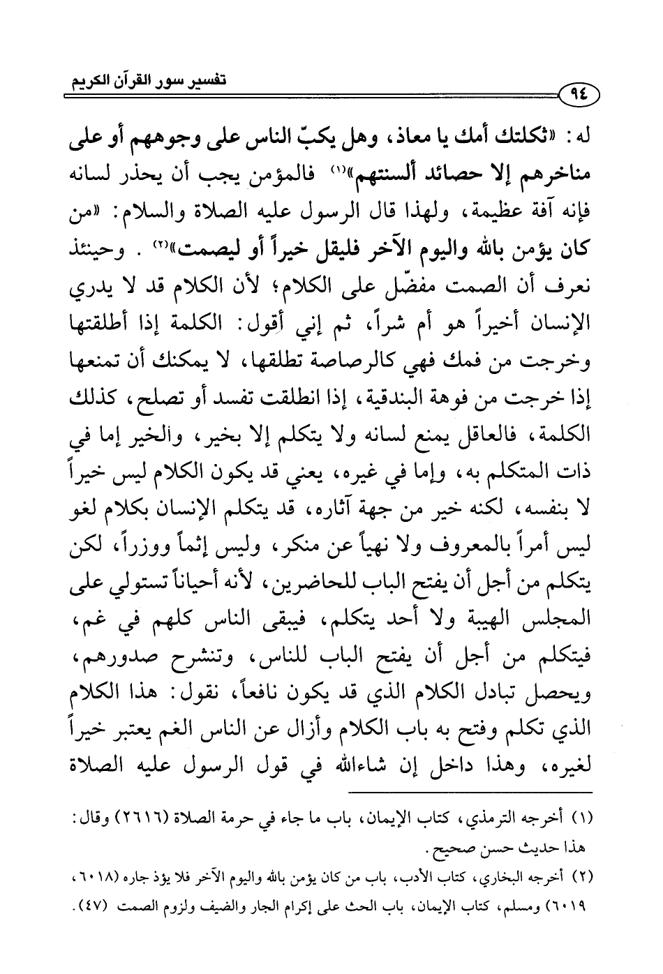 له: «ثكلتك أمك يا معاذ، وهل يكبّ الناس على وجوههم أو على مناخرهم إلا حصائد ألسنتهم» (¬١) فالمؤمن يجب أن يحذر لسانه فإنه آفة عظيمة، ولهذا قال الرسول عليه الصلاة والسلام: «من كان يؤمن بالله واليوم الآخر فليقل خيراً أو ليصمت» (¬٢) .