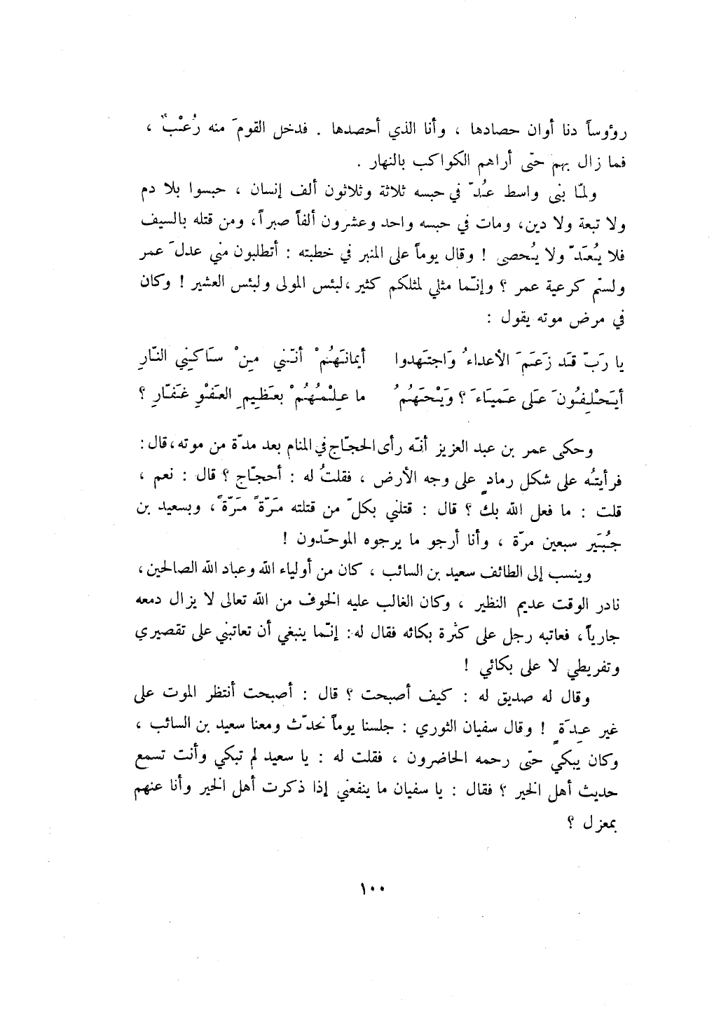 وحكى عمر بن عبد العزيز أنه رأى الحجاج في المنام بعد مدة من موته، قال: فرأيته على شكل رماد على وجه الأرض، فقلت له: أحجاج؟ قال: نعم، قلت: ما فعل الله بك؟ قال: قتلني بكل من قتلته مرةً مرةً، وبسعيد بن جبير سبعين مرة، وأنا أرجو ما يرجوه الموحدون! وينسب إلى الطائف سعيد بن السائب، كان من أولياء الله وعباد الله الصالحين، نادر الوقت عديم النظير، وكان الغالب عليه الخوف من الله تعالى لا يزال دمعه جارياً، فعاتبه رجل على كثرة بكائه فقال له: إنما ينبغي أن تعاتبني على تقصيري وتفريطي لا على بكائي!