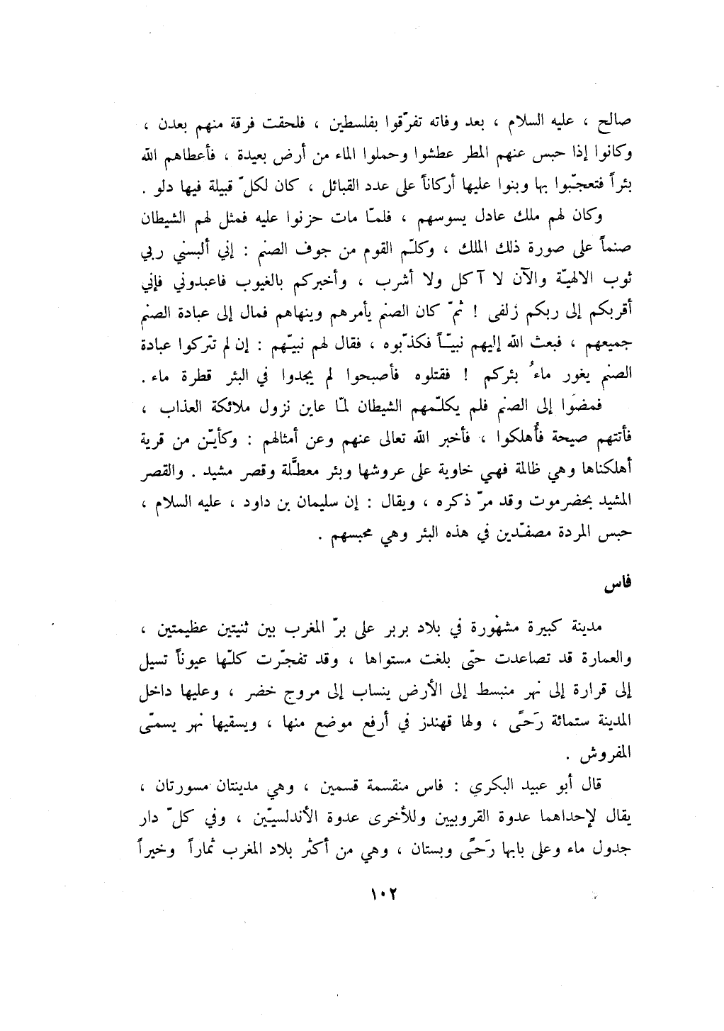 قال أبو عبيد البكرى: فاس منقسمة قسمين، وهي مدينتان مسورتان، يقال لإحداهما عدوة القروبيين وللأخرى عدوة الأندلسيين، وفي كل دار جدول ماء وعلى بابها رحىً وبستان، وهي من أكثر بلاد المغرب ثماراً وخيراً
