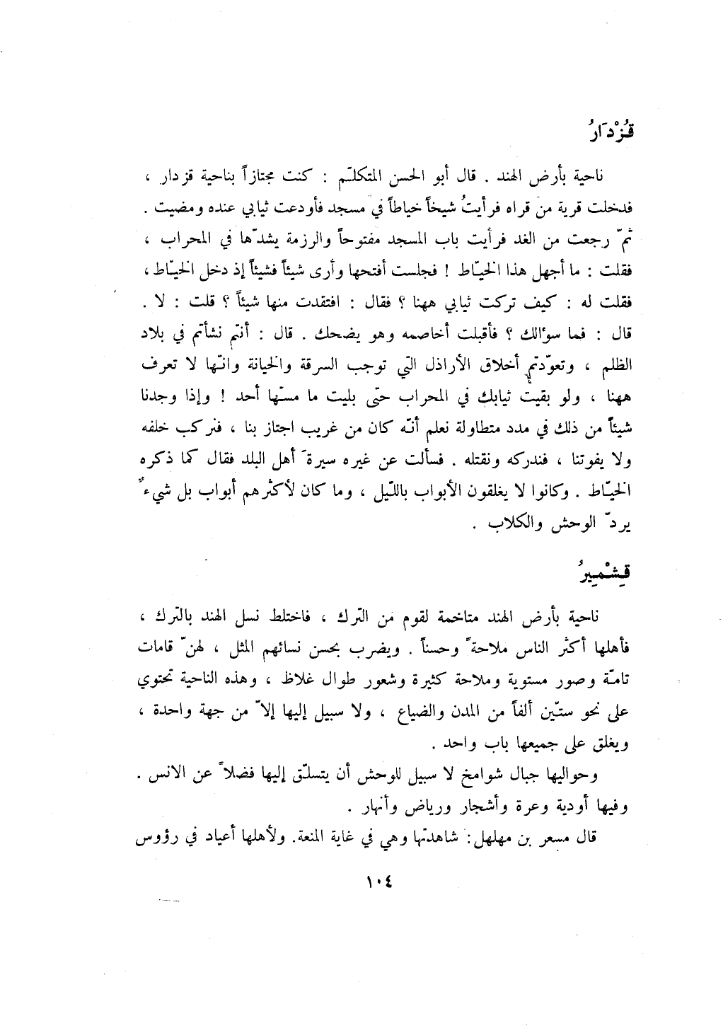 ناحية بأرض الهند. قال أبو الحسن المتكلم: كنت مجتازاً بناحية قزدار، فدخلت قرية من قراه فرأيت شيخاً خياطاً في مسجد فأودعت ثيابي عنده ومضيت. ثم رجعت من الغد فرأيت باب المسجد مفتوحاً والرزمة يشدها في المحراب، فقلت: ما أجهل هذا الخياط! فجلست أفتحها وأرى شيئاً فشيئاً إذ دخل الخياط، فقلت له: كيف تركت ثيابي ههنا؟ فقال: افتقدت منها شيئاً؟ قلت: لا. قال: فما سؤالك؟ فأقبلت أخاصمه وهو يضحك. قال: أنتم نشأتم في بلاد الظلم، وتعودتم أخلاق الأراذل التي توجب السرقة والخيانة وانها لا تعرف ههنا، ولو بقيت ثيابك في المحراب حتى بليت ما مستها أحد! وإذا وجدنا شيئاً من ذلك في مدد متطاولة نعلم أنه كان من غريب اجتاز بنا، فنركب خلفه ولا يفوتنا، فندركه ونقتله. فسألت عن غيره سيرة أهل البلد فقال كما ذكره الخياط. وكانوا لا يغلقون الأبواب بالليل، وما كان لأكثرهم أبواب بل شيء يرد الوحش والكلاب.