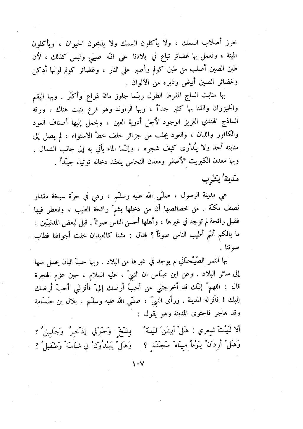 بها التمر الصيحاني لم يوجد في غيرها من البلاد. وبها حب البان يحمل منها إلى سائر البلاد. وعن ابن عباس ان النبي، عليه السلام، حين عزم الهجرة قال: اللهم إنك قد أخرجتني من أحب أرضك إلي فأنزلني أحب أرضك إليك! فأنزله المدينة، ورأى النبي، صلى الله عليه وسلم، بلال بن حمامة وقد هاجر فاجتوى المدينة وهو يقول: