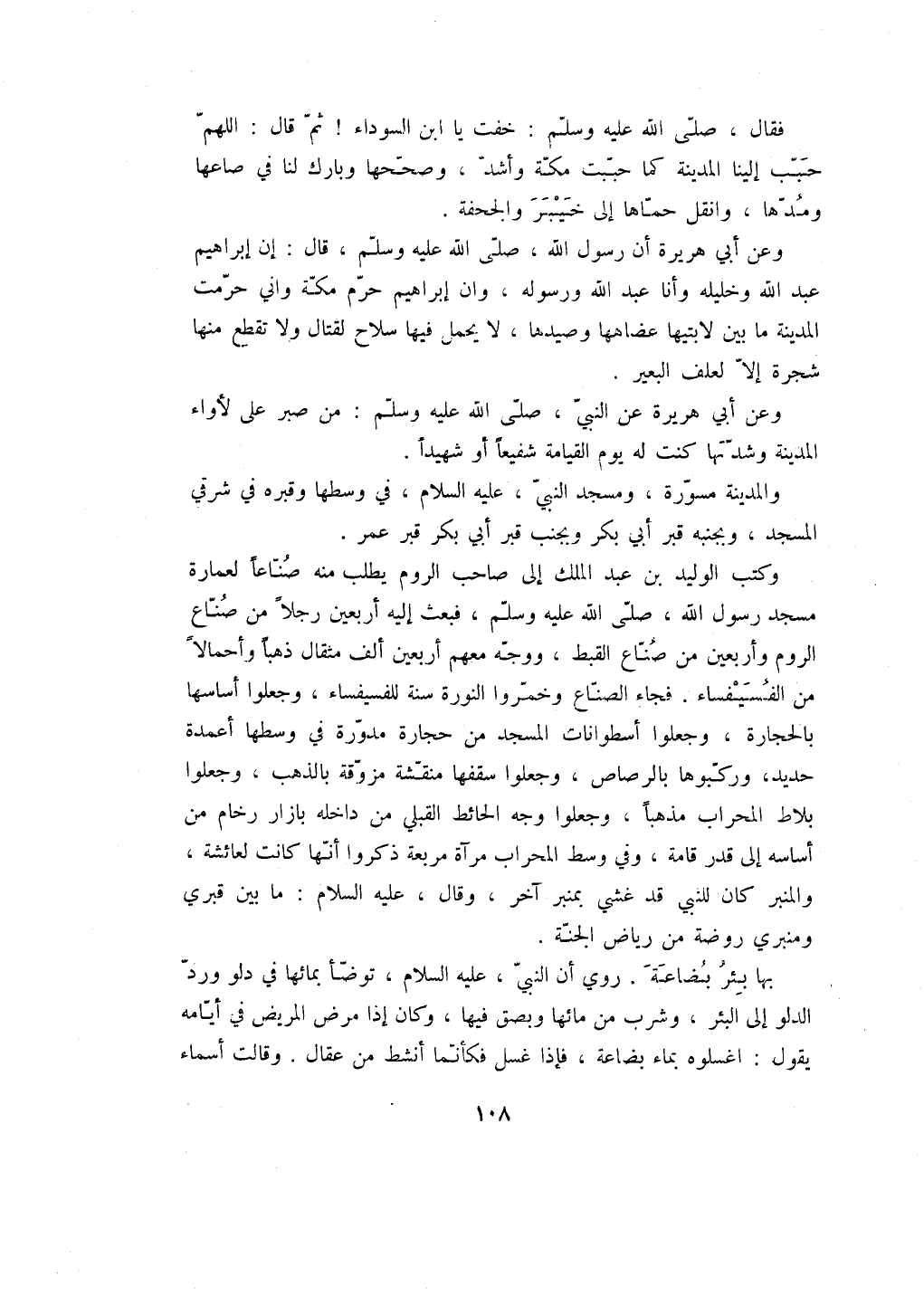 فقال، صلى الله عليه وسلم: خفت يا ابن السوداء! ثم قال: اللهم حبب إلينا المدينة كما حببت مكة وأشد، وصححها وبارك لنا في صاعها ومدها، وانقل حماها إلى خيبر والجحفة.