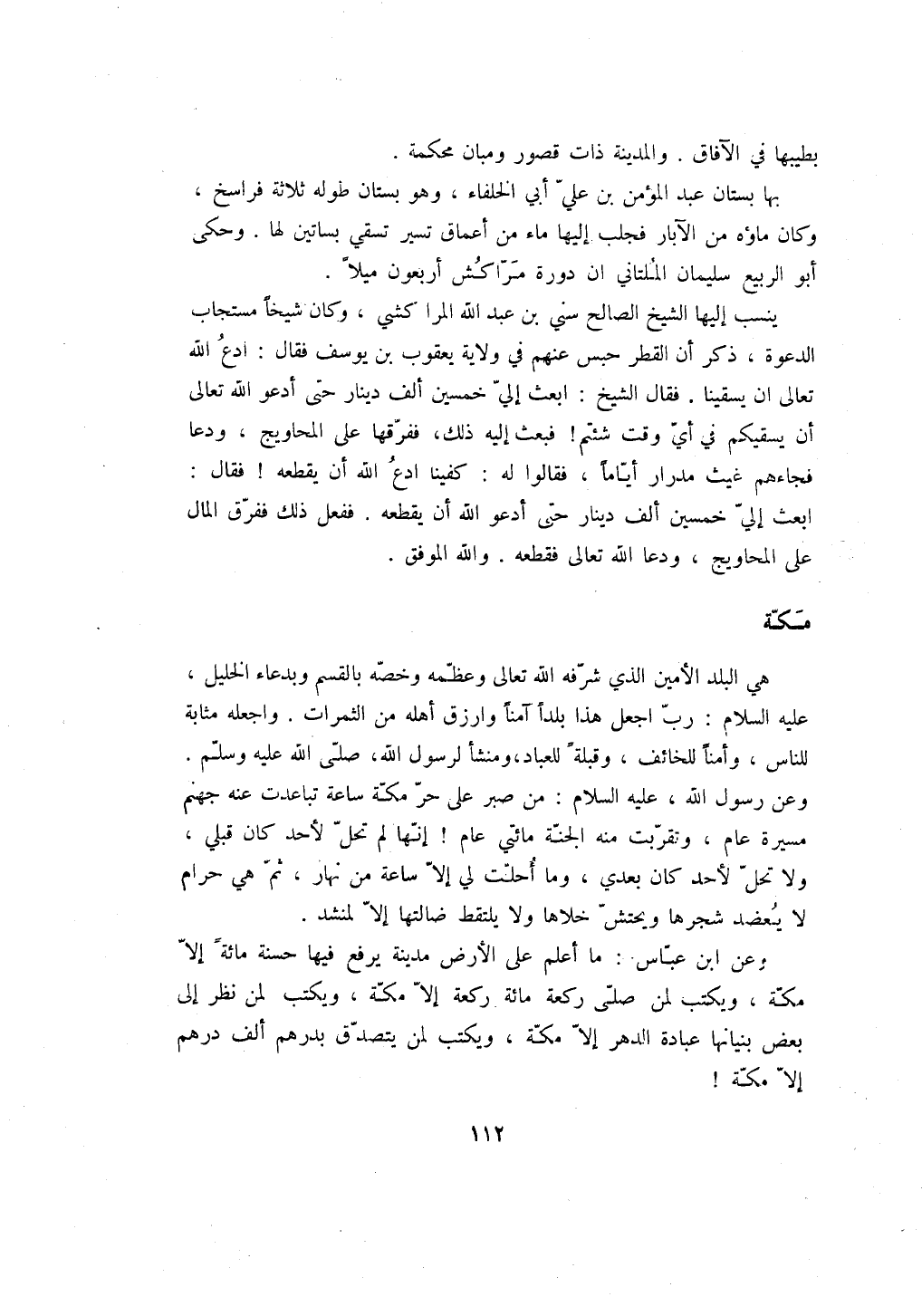 وعن ابن عباس: ما أعلم على الأرض مدينة يرفع فيها حسنة مائةً إلا مكة، ويكتب لمن صلى ركعة مائة ركعة إلا مكة، ويكتب لمن نظر إلى بعض بنيانها عبادة الدهر إلا مكة، ويكتب لمن يتصدق بدرهم ألف درهم إلا مكة!