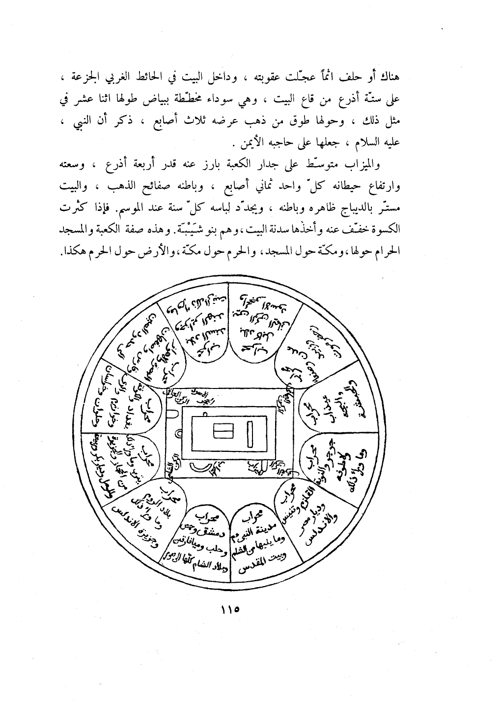 والميزاب متوسط على جدار الكعبة بارز عنه قدر أربعة أذرع، وسعته وارتفاع حيطانه كل واحد ثماني أصابع، وباطنه صفائح الذهب، والبيت مستر بالديباج ظاهره وباطنه، ويجدد لباسه كل سنة عند الموسم. فإذا كثرت الكسوة خفف عنه وأخذها سدنة البيت، وهم بنو شيبة. وهذه صفة الكعبة والمسجد الحرام حولها، ومكة حول المسجد، والحرم حول مكة، والأرض حول الحرم هكذا.