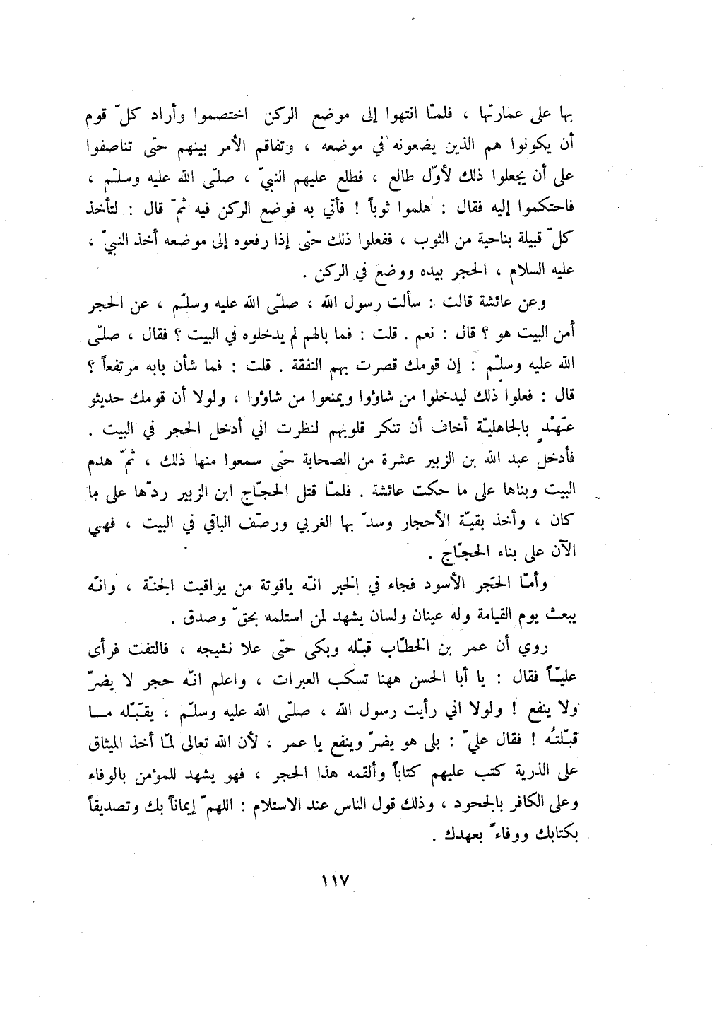 وعن عائشة قالت: سألت رسول الله، صلى الله عليه وسلم، عن الحجر أمن البيت هو؟ قال: نعم. قلت: فما بالهم لم يدخلوه في البيت؟ فقال، صلى الله عليه وسلم: إن قومك قصرت بهم النفقة. قلت: فما شأن بابه مرتفعاً؟ قال: فعلوا ذلك ليدخلوا من شاؤوا ويمنعوا من شاؤوا، ولولا أن قومك حديثو عهد بالجاهلية أخاف أن تنكر قلوبهم لنظرت اني أدخل الحجر في البيت. فأدخل عبد الله بن الزبير عشرة من الصحابة حتى سمعوا منها ذلك، ثم هدم البيت وبناها على ما حكت عائشة. فلما قتل الحجاج ابن الزبير ردها على ما كان، وأخذ بقية الأحجار وسد بها الغربي ورصف الباقي في البيت، فهي الآن على بناء الحجاج.