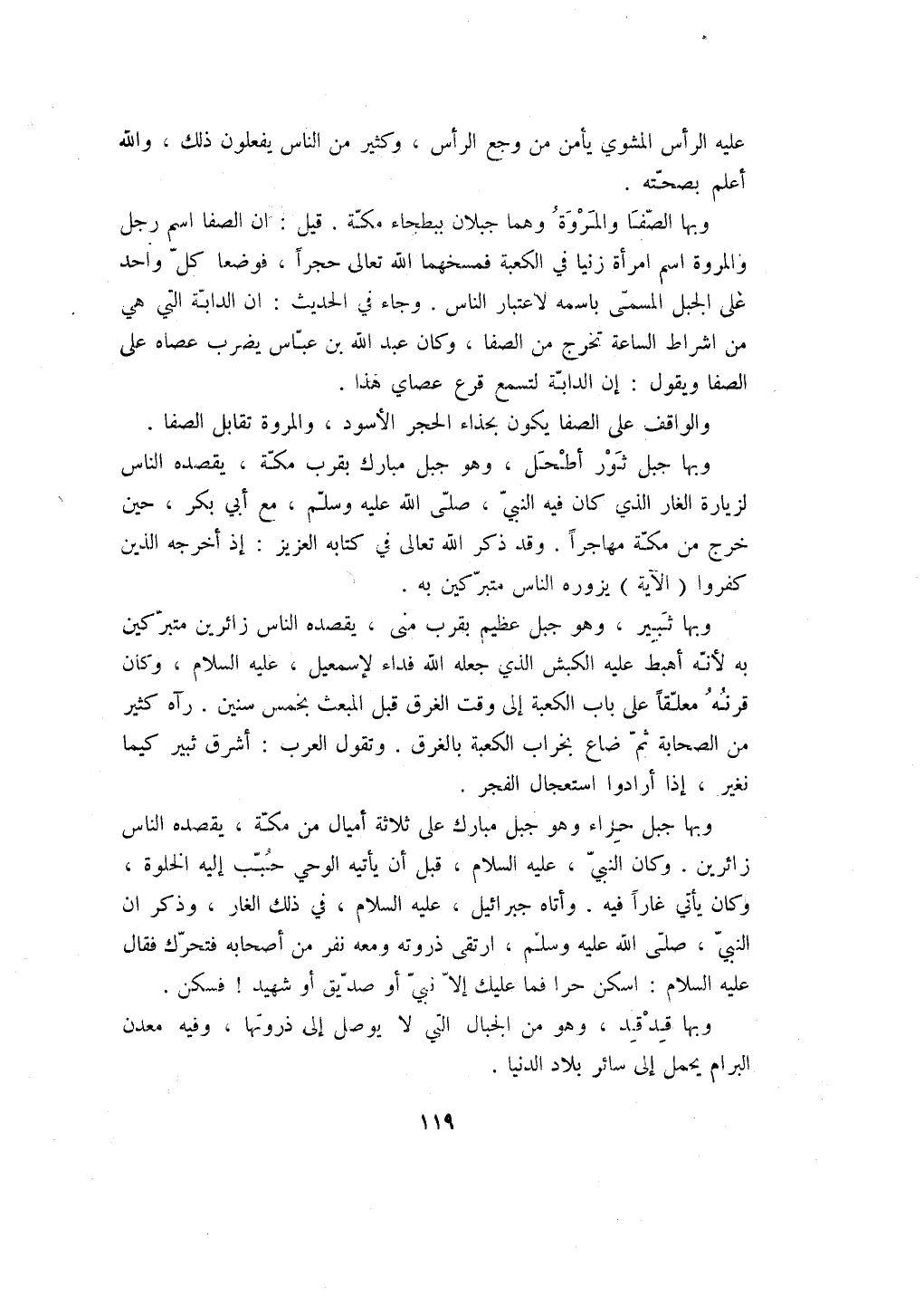وبها جبل حراء وهو جبل مبارك على ثلاثة أميال من مكة، يقصده الناس زائرين. وكان النبي، عليه السلام، قبل أن يأتيه الوحي حبب إليه الخلوة، وكان يأتي غاراً فيه. وأتاه جبرائيل، عليه السلام، في ذلك الغار، وذكر ان النبي، صلى الله عليه وسلم، ارتقى ذروته ومعه نفر من أصحابه فتحرك فقال عليه السلام: اسكن حرا فما عليك إلا نبي أو صديق أو شهيد! فسكن.