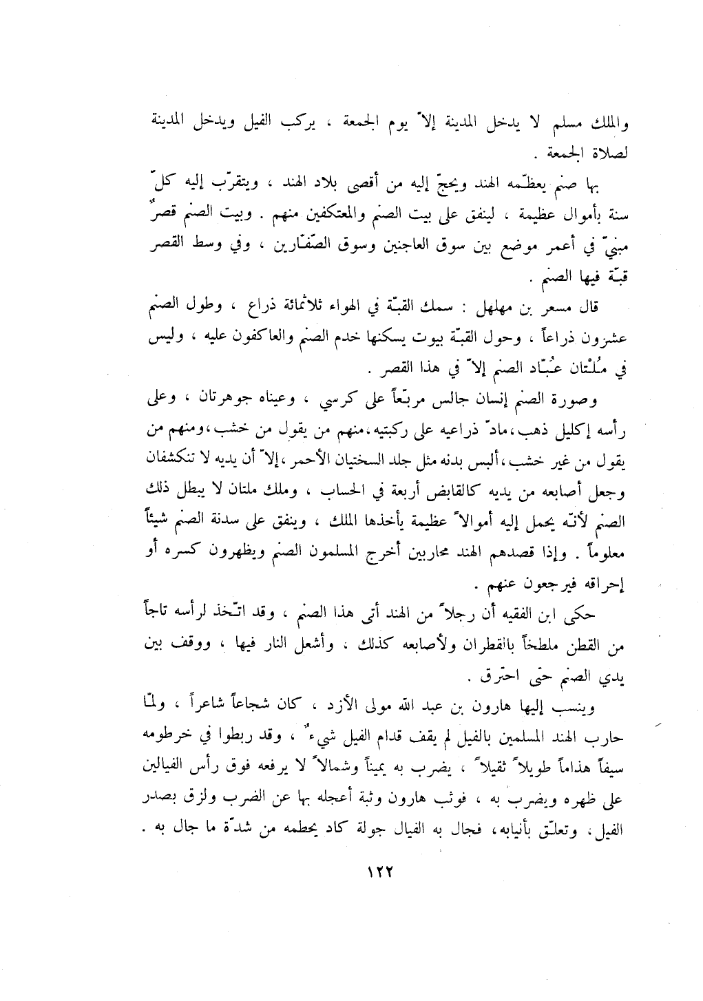 بها صنم يعظمه الهند ويحج إليه من أقصى بلاد الهند، ويتقرب إليه كل سنة بأموال عظيمة، لينفق على بيت الصنم والمعتكفين منهم. وبيت الصنم قصر مبني في أعمر موضع بين سوق العاجنين وسوق الصفارين، وفي وسط القصر قبة فيها الصنم.