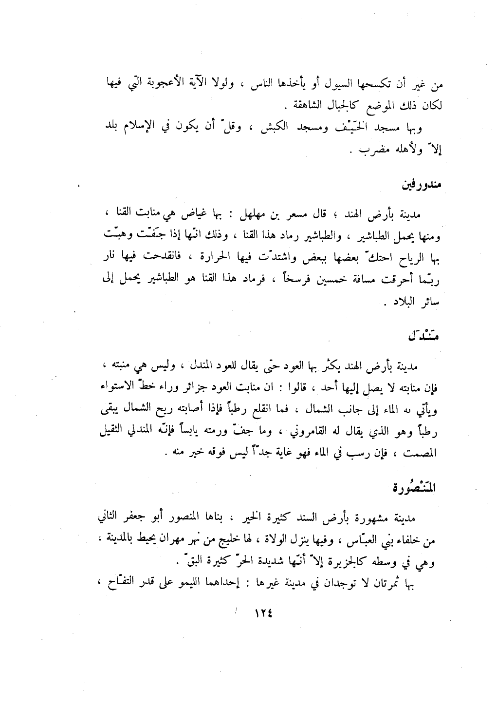 مدينة بأرض الهند يكثر بها العود حتى يقال للعود المندل، وليس هي منبته، فإن منابته لا يصل إليها أحد، قالوا: ان منابت العود جزائر وراء خط الاستواء ويأتي به الماء إلى جانب الشمال، فما انقلع رطباً فإذا أصابته ريح الشمال يبقى رطباً وهو الذي يقال له القامروني، وما جف ورمته يابساً فإنه المندلي الثقيل المصمت، فإن رسب في الماء فهو غاية جداً ليس فوقه خير منه.