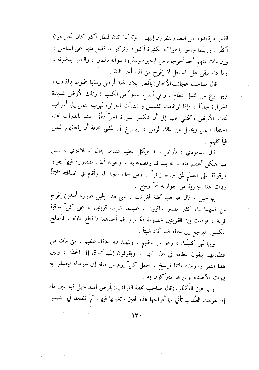 قال صاحب عجائب الأخبار: بأقصى بلاد الهند أرض رملها مخلوط بالذهب، وبها نوع من النمل عظام، وهي أسرع عدواً من الكلب! وتلك الأرض شديدة الحرارة جداً، فإذا ارتفعت الشمس واشتدت الحرارة تهرب النمل إلى أسراب تحت الأرض وتختفي فيها إلى أن تنكسر سورة الحر فتأتي الهند بالدواب عند اختفاء النمل ويحمل من ذلك الرمل، ويسرع في المشي مخافة أن يلحقهم النمل فيأكلهم.