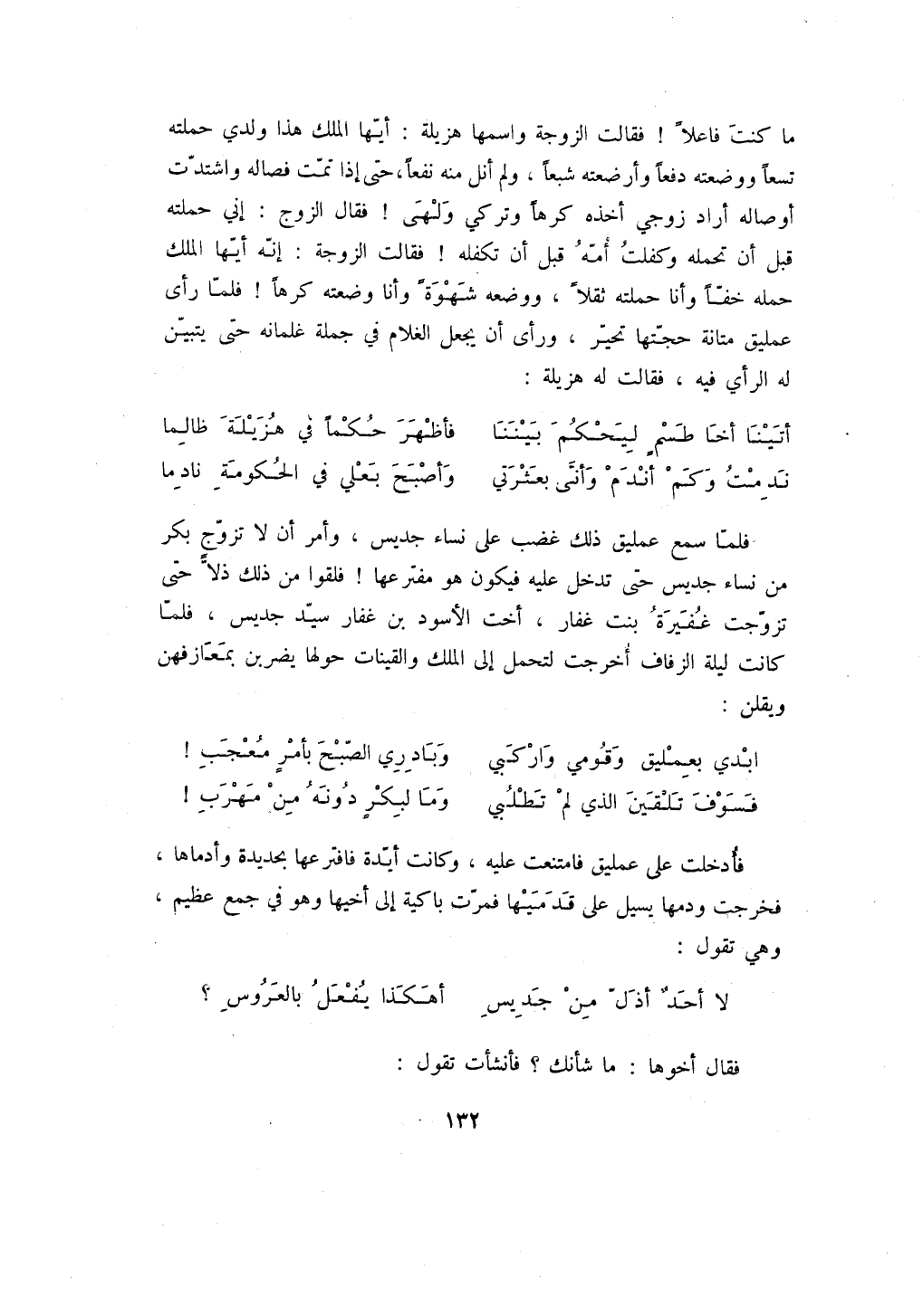 ما كنت فاعلاً! فقالت الزوجة واسمها هزيلة: أيها الملك هذا ولدي حملته تسعاً ووضعته دفعاً وأرضعته شبعاً، ولم أنل منه نفعاً، حتى إذا تمت فصاله واشتدت أوصاله أراد زوجي أخذه كرهاً وتركي ولهى! فقال الزوج: إني حملته قبل أن تحمله وكفلت أمه قبل أن تكفله! فقالت الزوجة: إنه أيها الملك حمله خفاً وأنا حملته ثقلاً، ووضعه شهوةً وأنا وضعته كرهاً! فلما رأى عمليق متانة حجتها تحير، ورأى أن يجعل الغلام في جملة غلمانه حتى يتبين له الرأي فيه، فقالت له هزيلة: