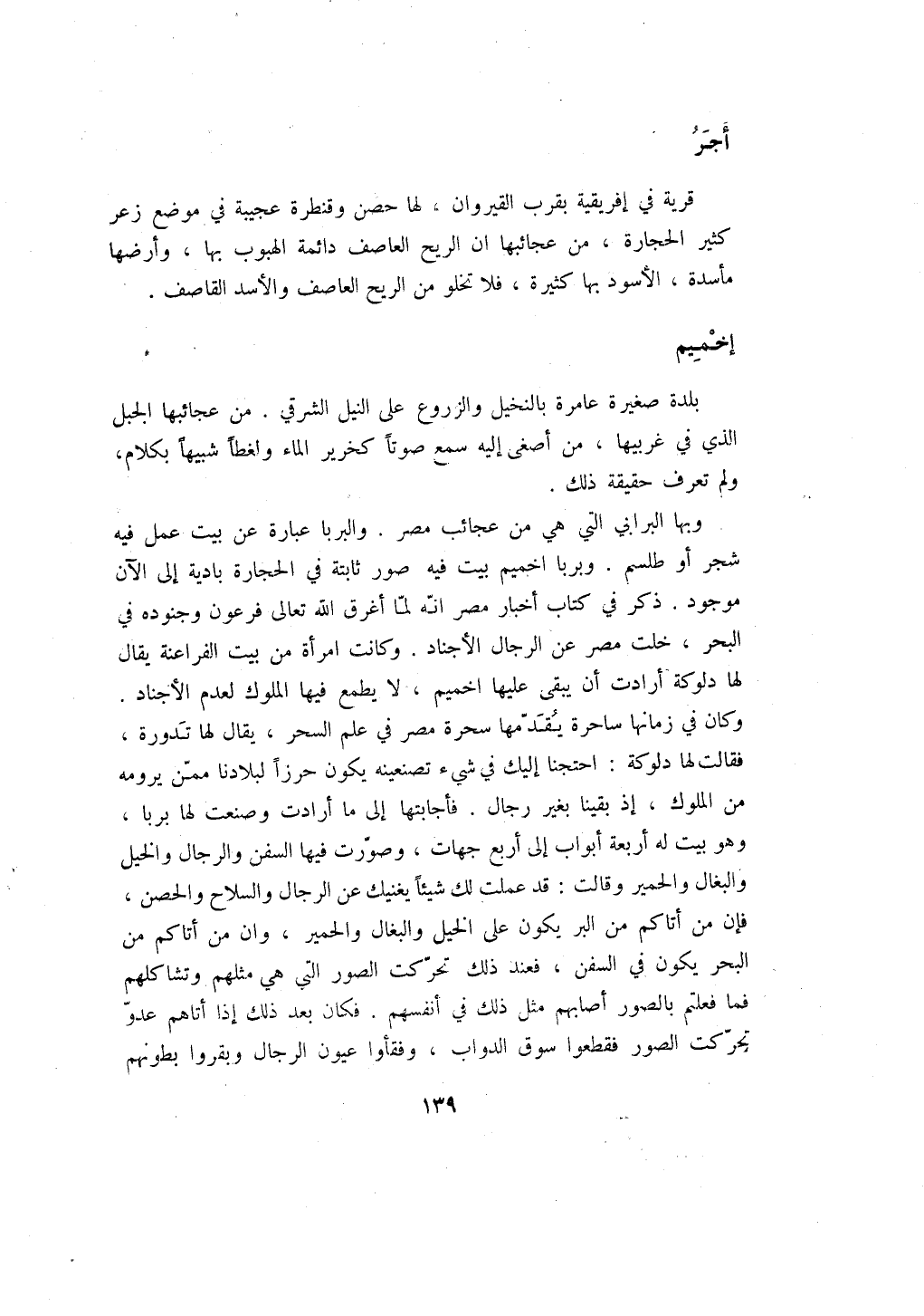 وبها البرابي التي هي من عجائب مصر. والبربا عبارة عن بيت عمل فيه شجر أو طلسم. وبربا اخميم بيت فيه صور ثابتة في الحجارة بادية إلى الآن موجود. ذكر في كتاب أخبار مصر انه لما أغرق الله تعالى فرعون وجنوده في البحر، خلت مصر عن الرجال الأجناد. وكانت امرأة من بيت الفراعنة يقال لها دلوكة أرادت أن يبقى عليها اخميم، لا يطمع فيها الملوك لعدم الأجناد. وكان في زمانها ساحرة يقدمها سحرة مصر في علم السحر، يقال لها تدورة، فقالت لها دلوكة: احتجنا إليك في شيء تصنعينه يكون حرزاً لبلادنا ممن يرومه من الملوك، إذ بقينا بغير رجال. فأجابتها إلى ما أرادت وصنعت لها بربا، وهو بيت له أربعة أبواب إلى أربع جهات، وصورت فيها السفن والرجال والخيل والبغال والحمير وقالت: قد عملت لك شيئاً يغنيك عن الرجال والسلاح والحصن، فإن من أتاكم من البر يكون على الخيل والبغال والحمير، وان من أتاكم من البحر يكون في السفن، فعند ذلك تحركت الصور التي هي مثلهم وتشاكلهم فما فعلتم بالصور أصابهم مثل ذلك في أنفسهم. فكان بعد ذلك إذا أتاهم عدو تحركت الصور فقطعوا سوق الدواب، وفقأوا عيون الرجال وبقروا بطونهم