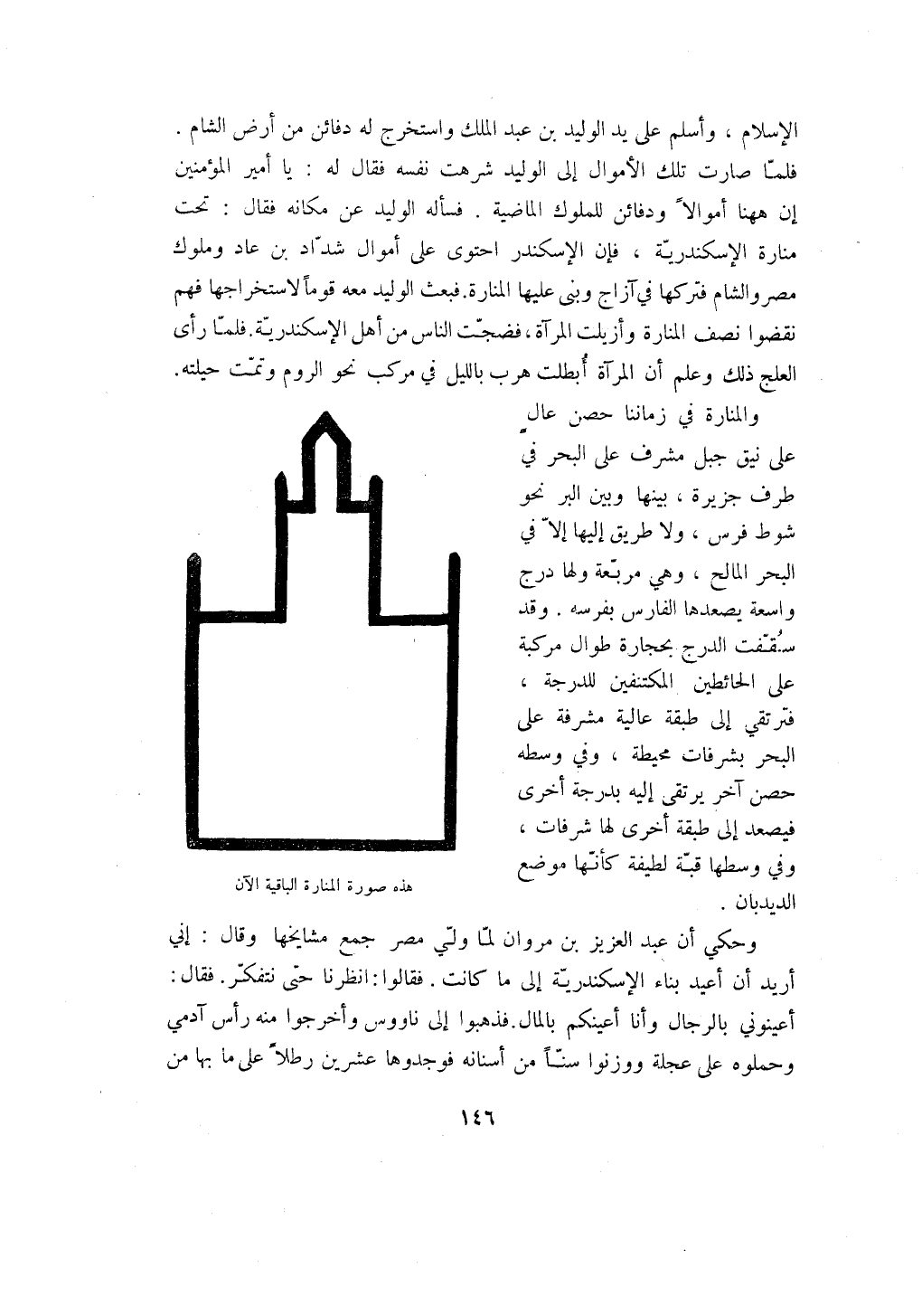 الإسلام، وأسلم على يد الوليد بن عبد الملك واستخرج له دفائن من أرض الشام. فلما صارت تلك الأموال إلى الوليد شرهت نفسه فقال له: يا أمير المؤمنين إن ههنا أموالاً ودفائن للملوك الماضية. فسأله الوليد عن مكانه فقال: تحت منارة الإسكندرية، فإن الإسكندر احتوى على أموال شداد بن عاد وملوك مصر والشام فتركها في آزاج وبنى عليها المنارة. فبعث الوليد معه قوماً لاستخراجها فهم نقضوا نصف المنارة وأزيلت المرآة، فضجت الناس من أهل الإسكندرية. فلما رأى العلج ذلك وعلم أن المرآة أبطلت هرب بالليل في مركب نحو الروم وتمت حيلته.