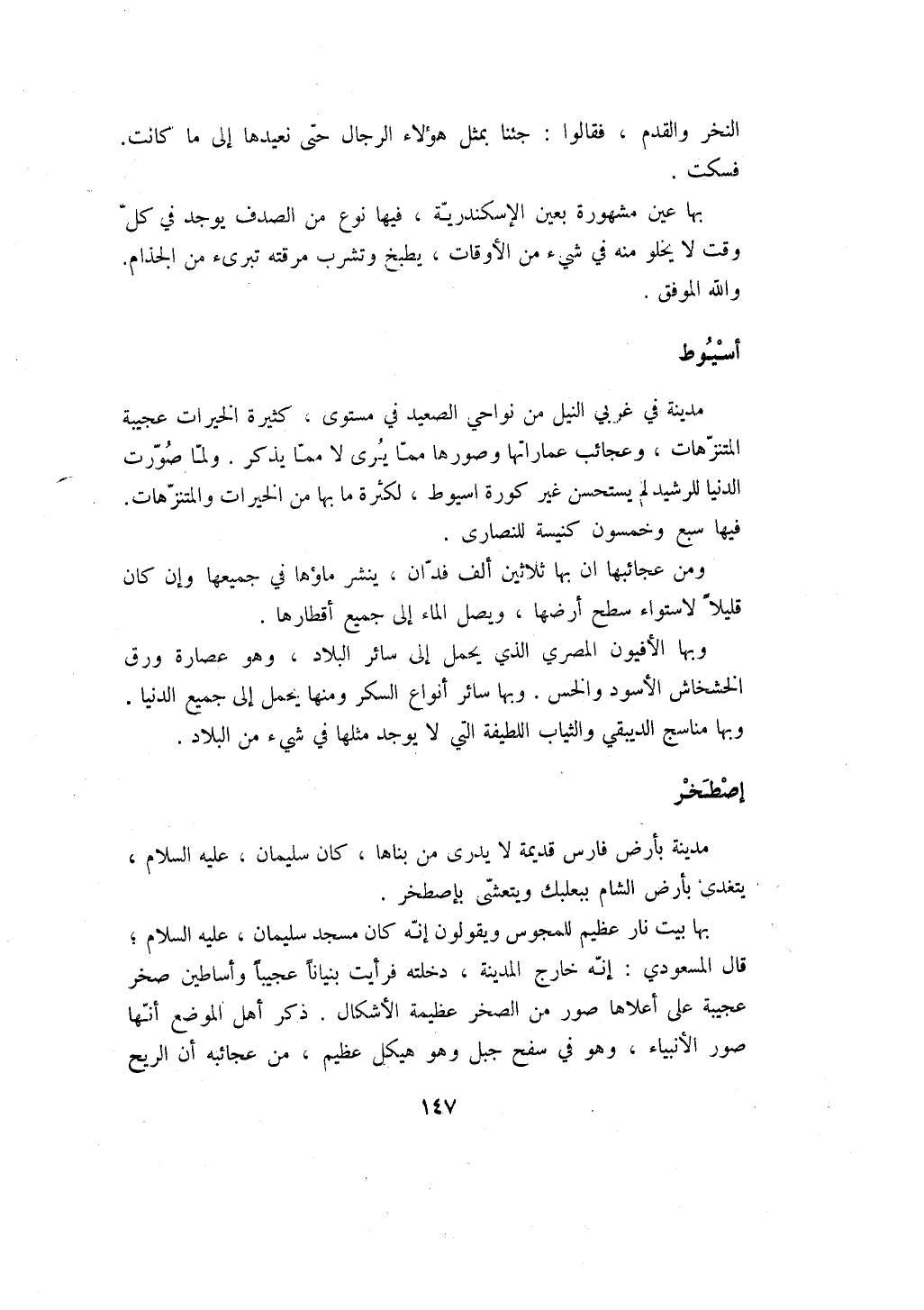بها عين مشهورة بعين الإسكندرية، فيها نوع من الصدف يوجد في كل وقت لا يخلو منه في شيء من الأوقات، يطبخ وتشرب مرقته تبريء من الجذام. والله الموفق.