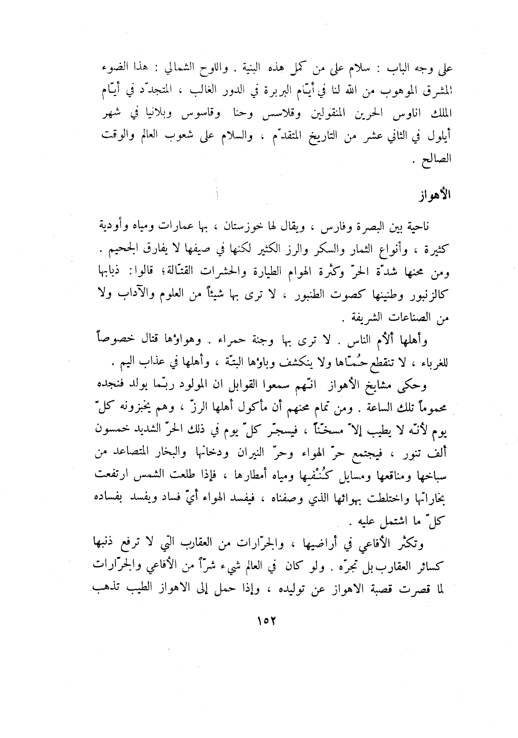 وحكى مشايخ الأهواز انهم سمعوا القوابل ان المولود ربما يولد فنجده محموماً تلك الساعة. ومن تمام محنهم أن مأكول أهلها الرز، وهم يخبزونه كل يوم لأنه لا يطيب إلا مسخناً، فيسجر كل يوم في ذلك الحر الشديد خمسون ألف تنور، فيجتمع حر الهواء وحر النيران ودخانها والبخار المتصاعد من سباخها ومناقعها ومسايل كنفها ومياه أمطارها، فإذا طلعت الشمس ارتفعت بخاراتها واختلطت بهوائها الذي وصفناه، فيفسد الهواء أي فساد ويفسد بفساده كل ما اشتمل عليه.
