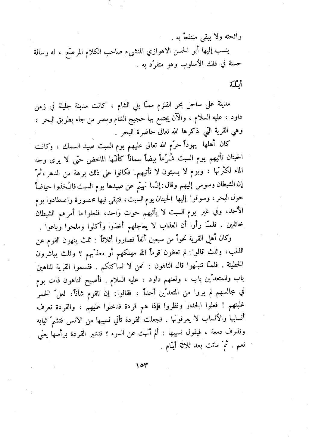 وكان أهل القرية نحواً من سبعين ألفاً فصاروا أثلاثاً: ثلث ينهون القوم عن الذنب، وثلث قالوا: لم تعظون قوماً الله مهلكهم أو معذبهم؟ وثلث يباشرون الخطيئة. فلما تنبهوا قال الناهون: نحن لا نساكنكم. فقسموا القرية للناهين باب وللمتعدين باب، ولعنهم داود، عليه السلام. فأصبح الناهون ذات يوم في مجالسهم لم يروا من المتعدين أحداً، فقالوا: إن للقوم شأناً، لعل الخمر غلبتهم! فعلوا الجدار ونظروا فإذا هم قردة فدخلوا عليهم، والقردة تعرف أنسابها والأنساب لا يعرفونها. فجعلت القردة تأتي نسيبها من الانس فتشم ثيابه وتذرف دمعة، فيقول نسيبها: ألم أنهك عن السوء؟ فتشير القردة برأسها يعني نعم. ثم ماتت بعد ثلاثة أيام.
