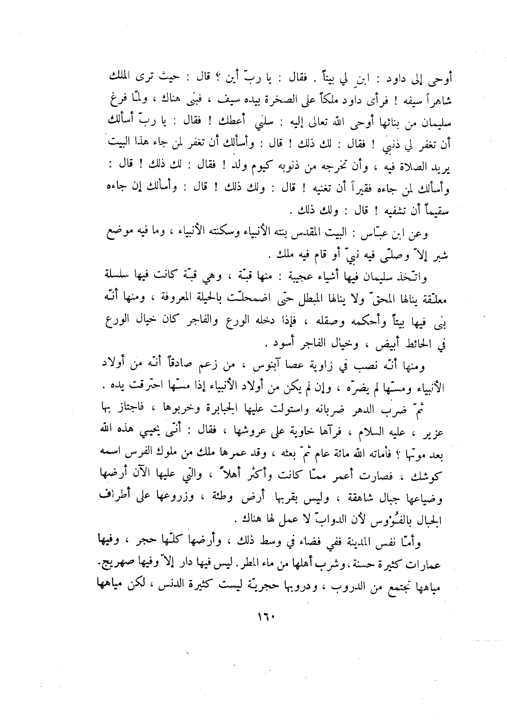أوحى إلى داود: ابن لي بيتاً. فقال: يا رب أين؟ قال: حيث ترى الملك شاهراً سيفه! فرأى داود ملكاً على الصخرة بيده سيف، فبنى هناك، ولما فرغ سليمان من بنائها أوحى الله تعالى إليه: سلني أعطك! فقال: يا رب أسألك أن تغفر لي ذنبي! فقال: لك ذلك! قال: وأسألك أن تغفر لمن جاء هذا البيت يريد الصلاة فيه، وأن تخرجه من ذنوبه كيوم ولد! فقال: لك ذلك! قال: وأسألك لمن جاءه فقيراً أن تغنيه! قال: ولك ذلك! قال: وأسألك إن جاءه سقيماً أن تشفيه! قال: ولك ذلك.