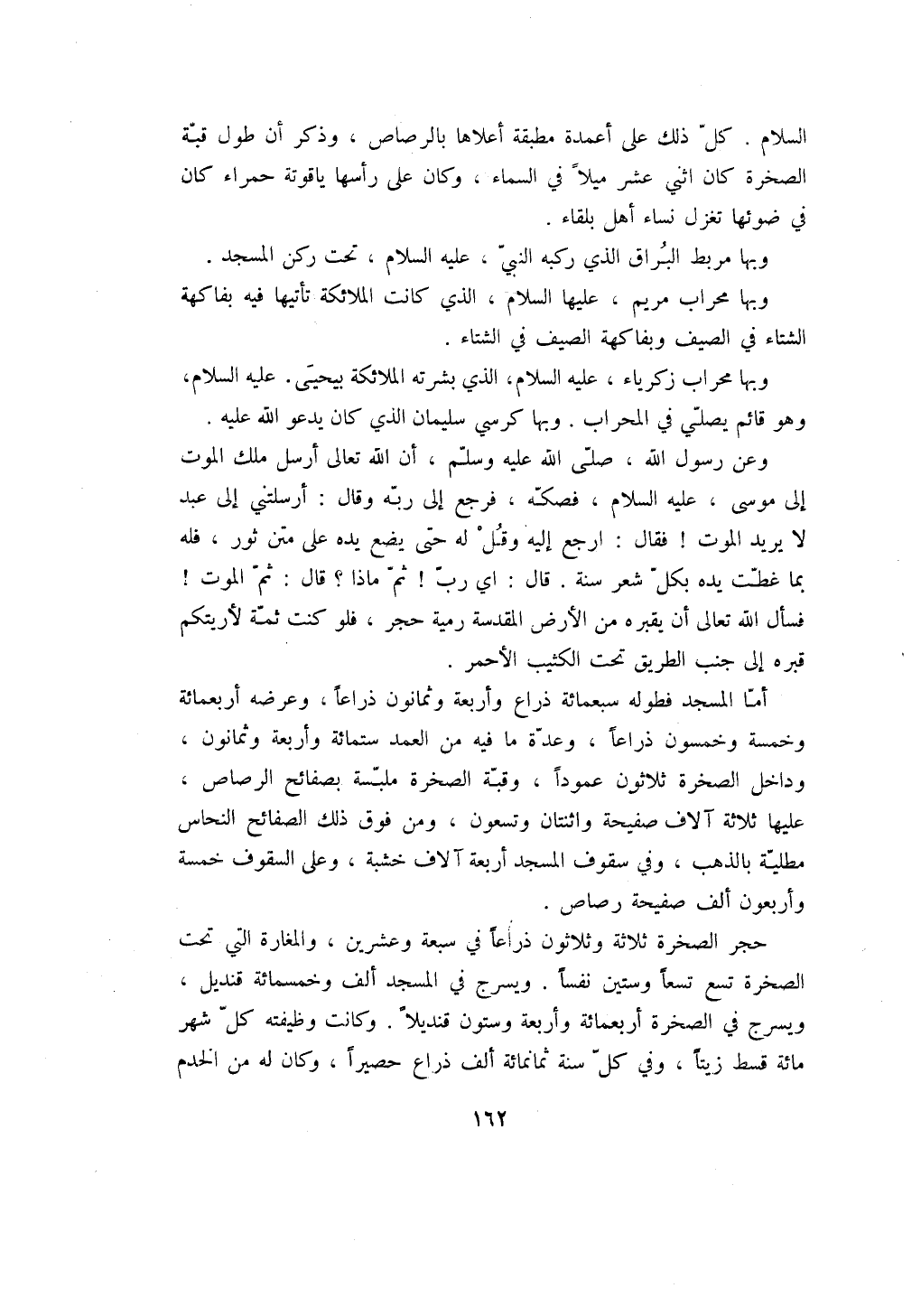 السلام. كل ذلك على أعمدة مطبقة أعلاها بالرصاص، وذكر أن طول قبة الصخرة كان اثني عشر ميلاً في السماء، وكان على رأسها ياقوتة حمراء كان في ضوئها تغزل نساء أهل بلقاء.