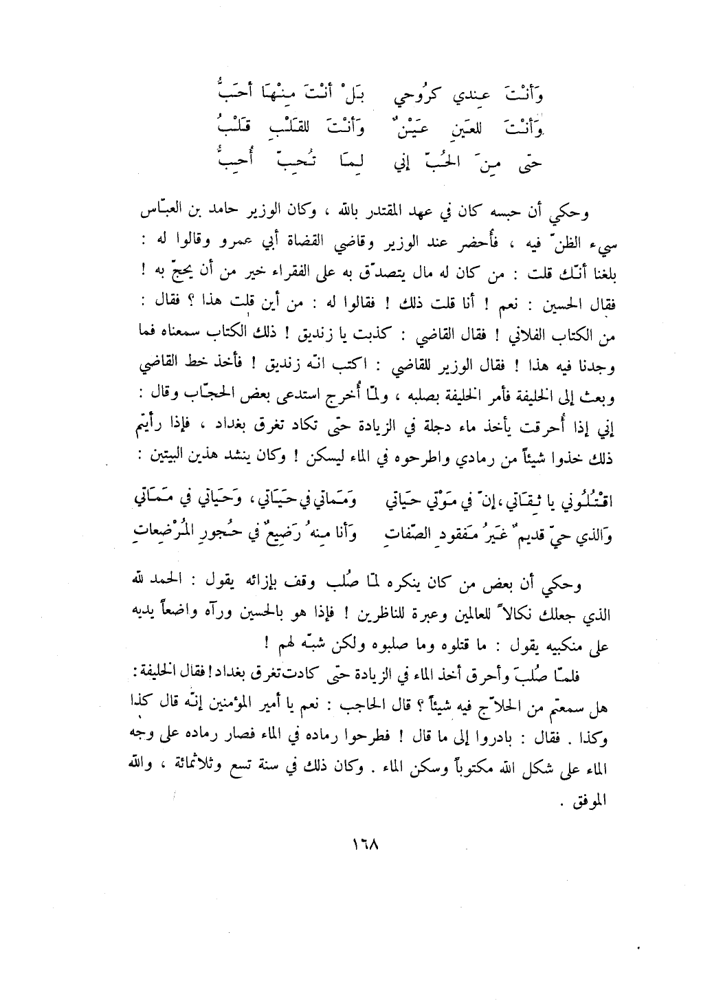 وحكي أن بعض من كان ينكره لما صلب وقف بإزائه يقول: الحمد لله الذي جعلك نكالاً للعالمين وعبرة للناظرين! فإذا هو بالحسين ورآه واضعاً يديه على منكبيه يقول: ما قتلوه وما صلبوه ولكن شبه لهم! فلما صلب وأحرق أخذ الماء في الزيادة حتى كادت تغرق بغداد! فقال الخليفة: هل سمعتم من الحلاج فيه شيئاً؟ قال الحاجب: نعم يا أمير المؤمنين إنه قال كذا وكذا. فقال: بادروا إلى ما قال! فطرحوا رماده في الماء فصار رماده على وجه الماء على شكل الله مكتوباً وسكن الماء. وكان ذلك في سنة تسع وثلاثمائة، والله الموفق.