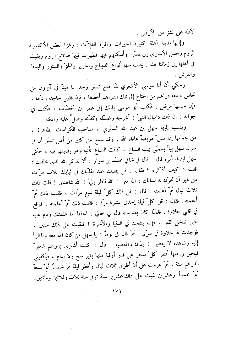 وينسب إليها سهل بن عبد الله التستري، صاحب الكرامات الظاهرة، من جملتها إذا مس مريضاً عافاه الله، وقد سمع من كثير من أهل تستر أن في منزل سهل بيتاً يسمى بيت السباع، كانت السباع تأتيه وهو يضيفها فيه، حكى سهل ابتداء أمره قال: قال لي خالي محمد بن سوار: ألا تذكر الله الذي خلقك؟ قلت: كيف أذكره؟ فقال: قل بقلبك عند تقلبك في ثيابك ثلاث مرات من غير أن تحرك به لسانك: الله معي! الله ناظر إلي! الله شاهدي! قلت ذلك ثلاث ليال ثم أعلمته. قال: قل ذلك كل ليلة سبع مرات، فقلت ذلك ثم أعلمته. فقال: قل كل ليلة إحدى عشرة مرة، فقلت ذلك ثم أعلمته، فوقع في قلبي حلاوة. فلما كان بعد سنة قال لي خالي: احفظ ما علمتك ودم عليه حتى تدخل القبر، فإنه ينفعك في الدنيا والآخرة! فبقيت على ذلك سنين، فوجدت لها حلاوة في سري، ثم قال لي يوماً: يا سهل من كان الله معه وناظراً إليه وشاهده لا يعصي! إياك والمعصية! قال: كنت أشتري بدرهم شعيراً فيخبز لي منها أفطر كل سحر على قدر أوقية منها بغير ملح ولا ادام، فيكفيني الدرهم سنة، ثم عزمت على أن أطوي ثلاث ليال وأفطر ليلة ثم خمساً ثم سبعاً ثم خمساً وعشرين. بقيت على ذلك عشرين سنة. توفي سنة ثلاث وثلاثين ومائتين.