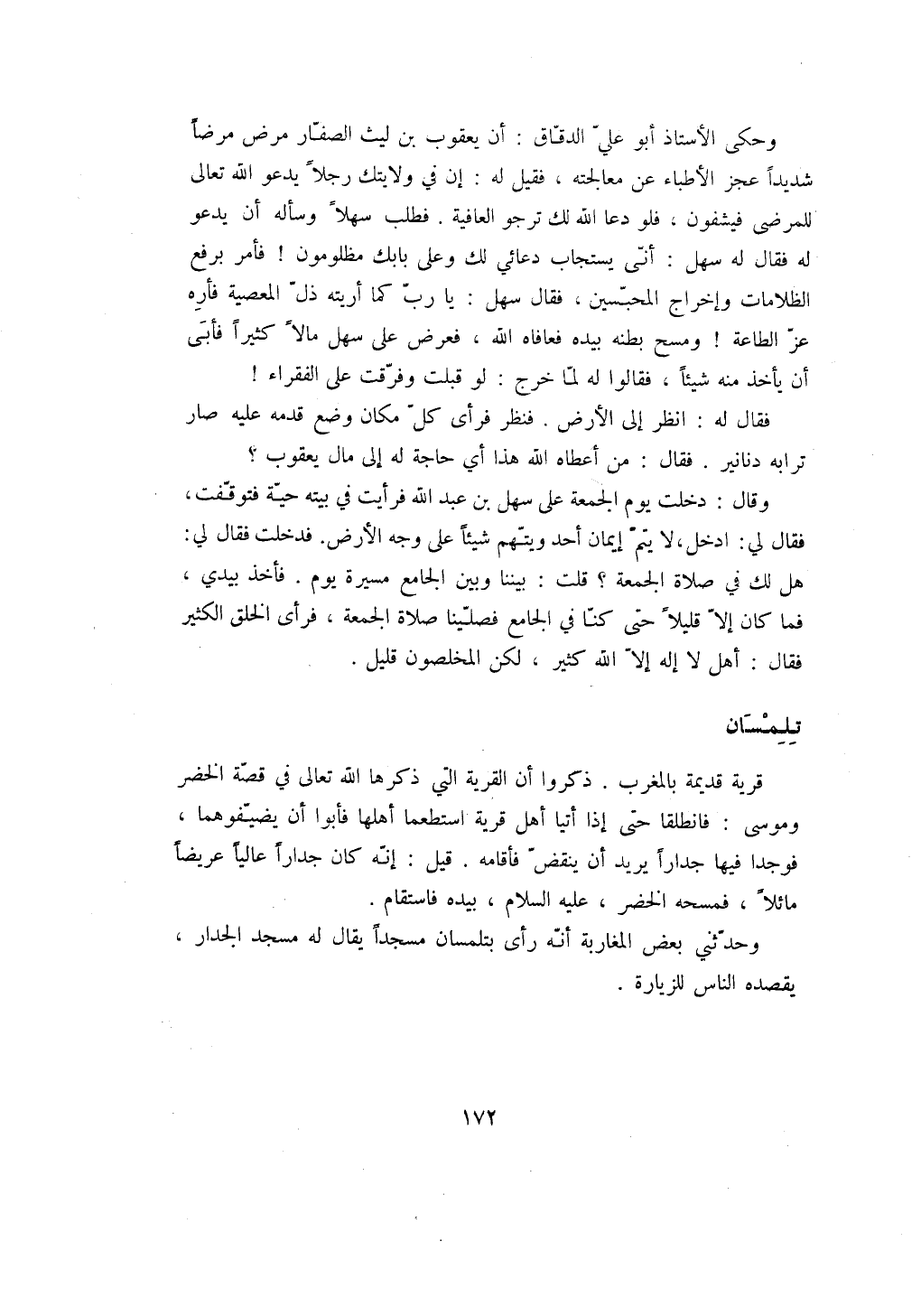 وحكى الأستاذ أبو علي الدقاق: أن يعقوب بن ليث الصفار مرض مرضاً شديداً عجز الأطباء عن معالجته، فقيل له: إن في ولايتك رجلاً يدعو الله تعالى للمرضى فيشفون، فلو دعا الله لك ترجو العافية. فطلب سهلاً وسأله أن يدعو له فقال له سهل: أنى يستجاب دعائي لك وعلى بابك مظلومون! فأمر برفع الظلامات وإخراج المحبسين، فقال سهل: يا رب كما أريته ذل المعصية فأره عز الطاعة! ومسح بطنه بيده فعافاه الله، فعرض على سهل مالاً كثيراً فأبى أن يأخذ منه شيئاً، فقالوا له لما خرج: لو قبلت وفرقت على الفقراء! فقال له: انظر إلى الأرض. فنظر فرأى كل مكان وضع قدمه عليه صار ترابه دنانير. فقال: من أعطاه الله هذا أي حاجة له إلى مال يعقوب؟ وقال: دخلت يوم الجمعة على سهل بن عبد الله فرأيت في بيته حية فتوقفت، فقال لي: ادخل، لا يتم إيمان أحد ويتهم شيئاً على وجه الأرض. فدخلت فقال لي: هل لك في صلاة الجمعة؟ قلت: بيننا وبين الجامع مسيرة يوم. فأخذ بيدي، فما كان إلا قليلاً حتى كنا في الجامع فصلينا صلاة الجمعة، فرأى الخلق الكثير فقال: أهل لا إله إلا الله كثير، لكن المخلصون قليل.