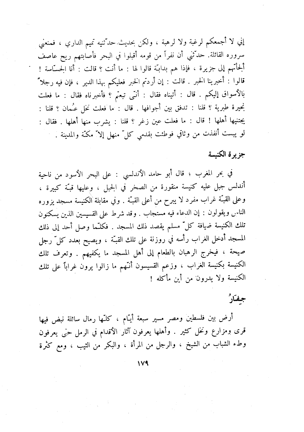 في بحر المغرب؛ قال أبو حامد الأندلسي: على البحر الأسود من ناحية أندلس جبل عليه كنيسة منقورة من الصخر في الجبل، وعليها قبة كبيرة، وعلى القبة غراب مفرد لا يبرح من أعلى القبة. وفي مقابلة الكنيسة مسجد يزوره الناس ويقولون: إن الدعاء فيه مستجاب. وقد شرط على القسيسين الذين يسكنون تلك الكنيسة ضيافة كل مسلم يقصد ذلك المسجد. فكلما وصل أحد إلى ذلك المسجد أدخل الغراب رأسه في روزنة على تلك القبة، ويصيح بعدد كل رجل صيحة، فيخرج الرهبان بالطعام إلى أهل المسجد ما يكفيهم. وتعرف تلك الكنيسة بكنيسة الغراب، وزعم القسيسون أنهم ما زالوا يرون غراباً على تلك الكنيسة ولا يدرون من أين مأكله!