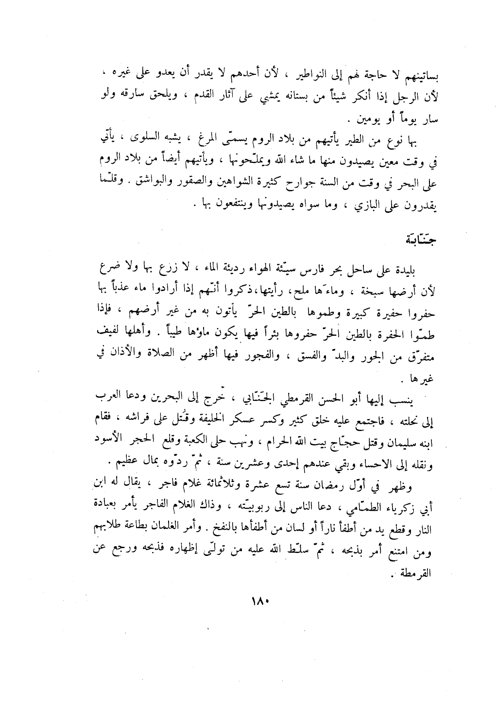 ينسب إليها أبو الحسن القرمطي الجنابي، خرج إلى البحرين ودعا العرب إلى نحلته، فاجتمع عليه خلق كثير وكسر عسكر الخليفة وقتل على فراشه، فقام ابنه سليمان وقتل حجاج بيت الله الحرام، ونهب على الكعبة وقلع الحجر الأسود ونقله إلى الاحساء وبقي عندهم إحدى وعشرين سنة، ثم ردوه بمال عظيم.