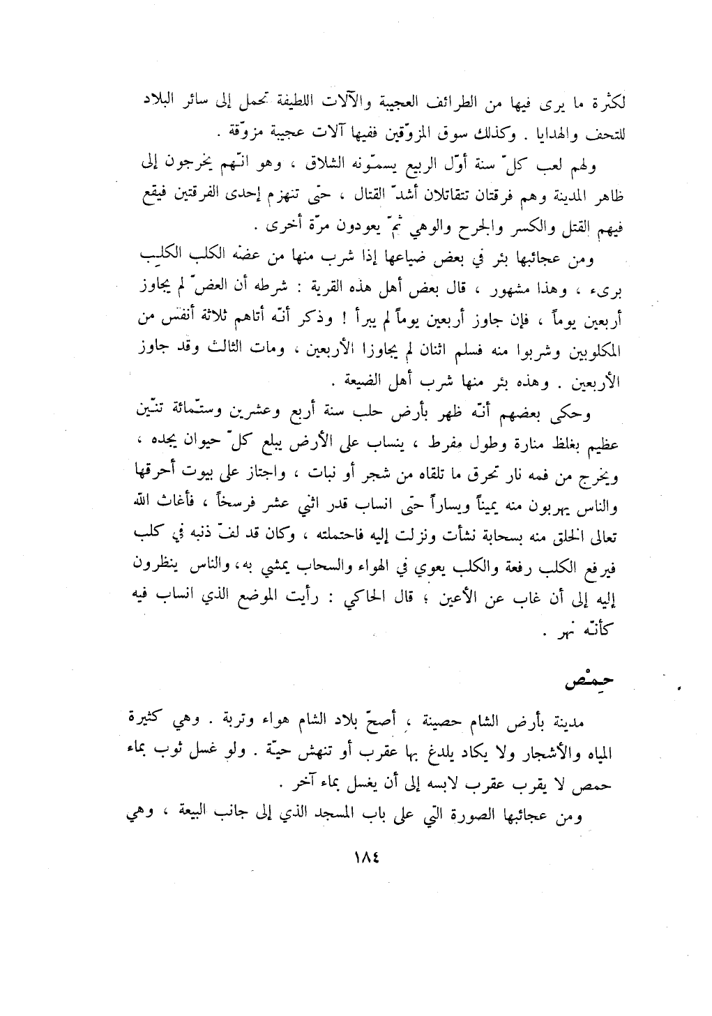 مدينة بأرض الشام حصينة، أصح بلاد الشام هواء وتربة. وهي كثيرة المياه والأشجار ولا يكاد يلدغ بها عقرب أو تنهش حية. ولو غسل ثوب بماء حمص لا يقرب عقرب لابسه إلى أن يغسل بماء آخر.