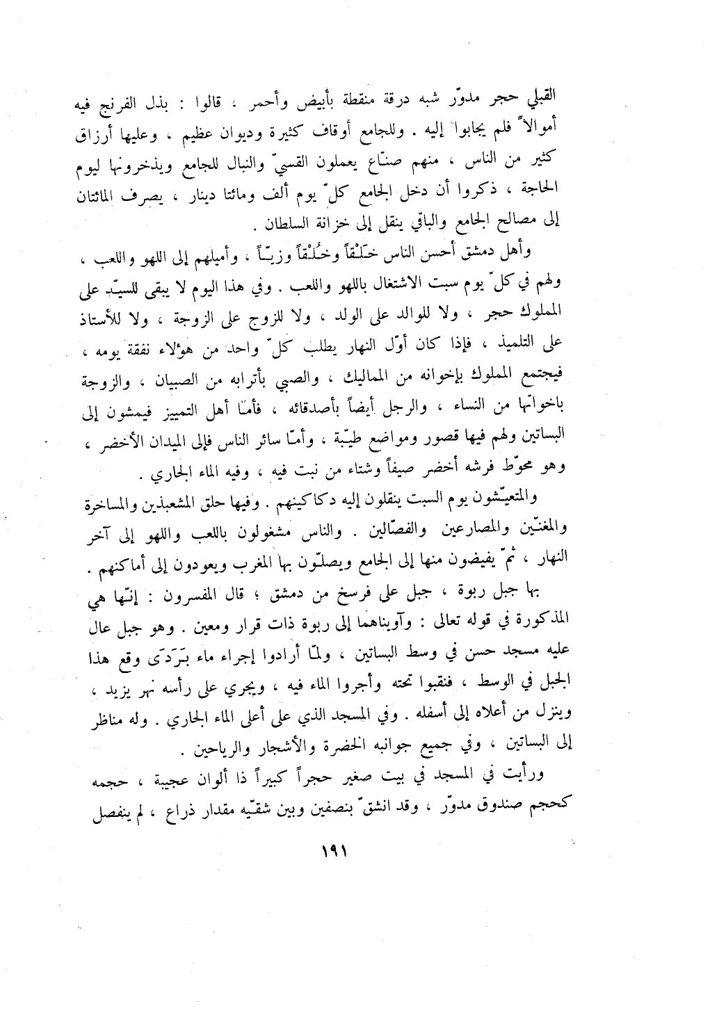 وأهل دمشق أحسن الناس خلقاً وخلقاً وزياً، وأميلهم إلى اللهو واللعب، ولهم في كل يوم سبت الاشتغال باللهو واللعب. وفي هذا اليوم لا يبقى للسيد على المملوك حجر، ولا للوالد على الولد، ولا للزوج على الزوجة، ولا للأستاذ على التلميذ، فإذا كان أول النهار يطلب كل واحد من هؤلاء نفقة يومه، فيجتمع المملوك بإخوانه من المماليك، والصبي بأترابه من الصبيان، والزوجة باخواتها من النساء، والرجل أيضاً بأصدقائه، فأما أهل التمييز فيمشون إلى البساتين ولهم فيها قصور ومواضع طيبة، وأما سائر الناس فإلى الميدان الأخضر، وهو محوط فرشه أخضر صيفاً وشتاء من نبت فيه، وفيه الماء الجاري.