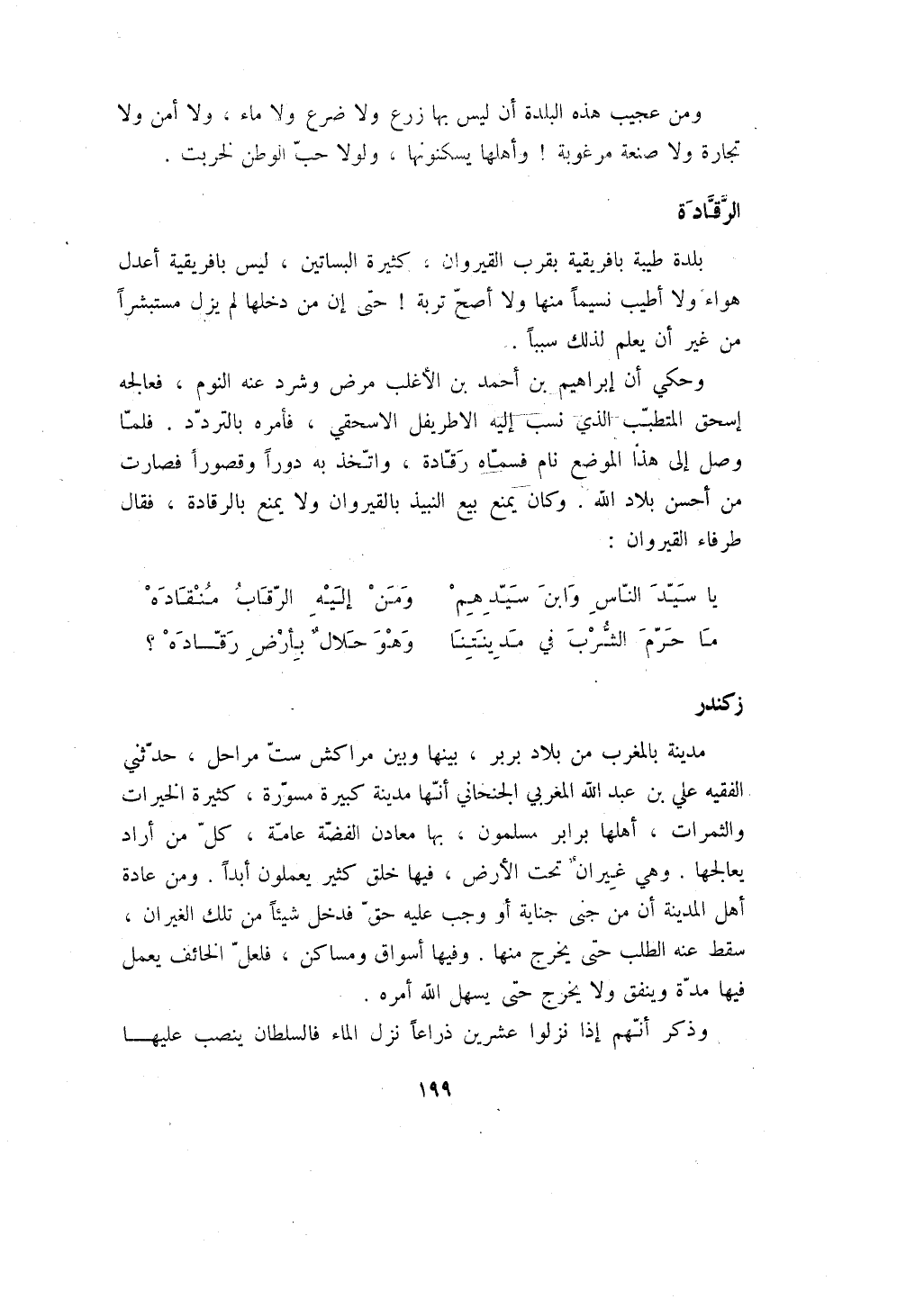 ومن عجيب هذه البلدة أن ليس بها زرع ولا ضرع ولا ماء، ولا أمن ولا تجارة ولا صنعة مرغوبة! وأهلها يسكنونها، ولولا حب الوطن لخربت.