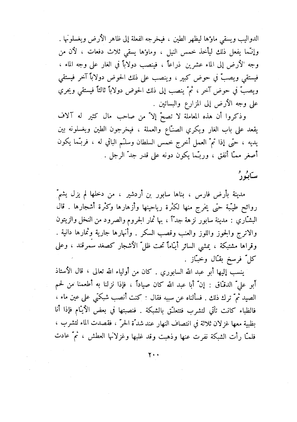 الدواليب ويسقي ماؤها ليظهر الطين، فيخرجه الفلعة إلى ظاهر الأرض ويغسلونها. وإنما يفعل ذلك ليأخذ خمس النيل، وماؤها يسقي ثلاث دفعات، لأن من وجه الأرض إلى الماء عشرين ذراعاً، فينصب دولاباً في الغار على وجه الماء، فيستقي ويصب في حوض كبير، وينصب على ذلك الحوض دولاباً آخر فيستقي ويصب في حوض آخر، ثم ينصب إلى ذلك الحوض دولاباً ثالثاً فيستقي ويجري على وجه الأرض إلى المزارع والبساتين.