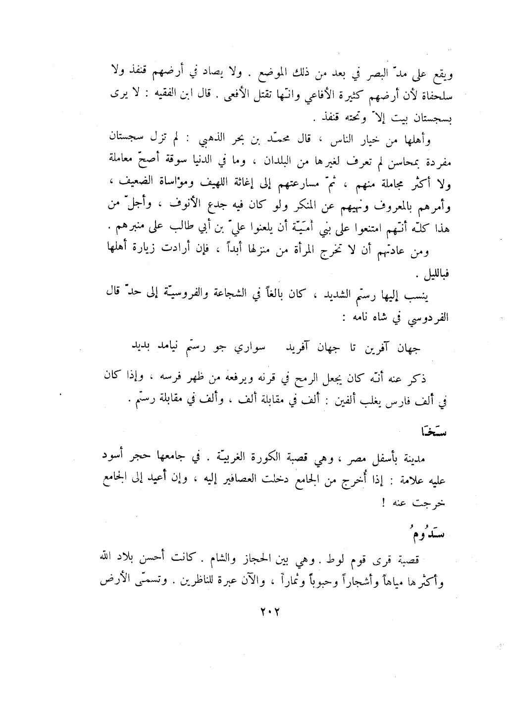 ويقع على مد البصر في بعد من ذلك الموضع. ولا يصاد في أرضهم قنفذ ولا سلحفاة لأن أرضهم كثيرة الأفاعي وانها تقتل الأفعى. قال ابن الفقيه: لا يرى بسجستان بيت إلا وتحته قنفذ.