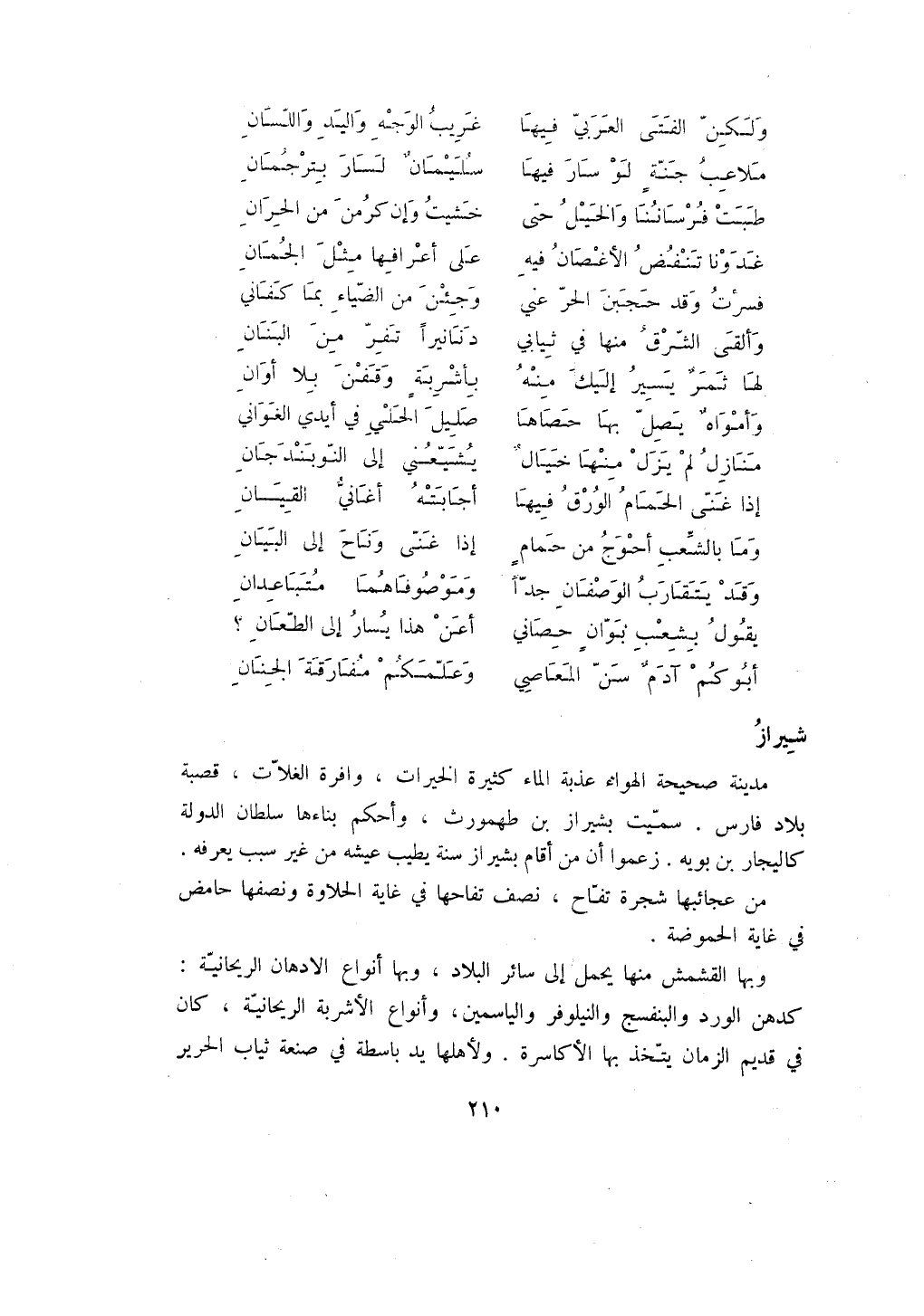 مدينة صحيحة الهواء عذبة الماء كثيرة الخيرات، وافرة الغلات، قصبة بلاد فارس. سميت بشيراز بن طهمورث، وأحكم بناءها سلطان الدولة كاليجار بن بويه. زعموا أن من أقام بشيراز سنة يطيب عيشه من غير سبب يعرفه.