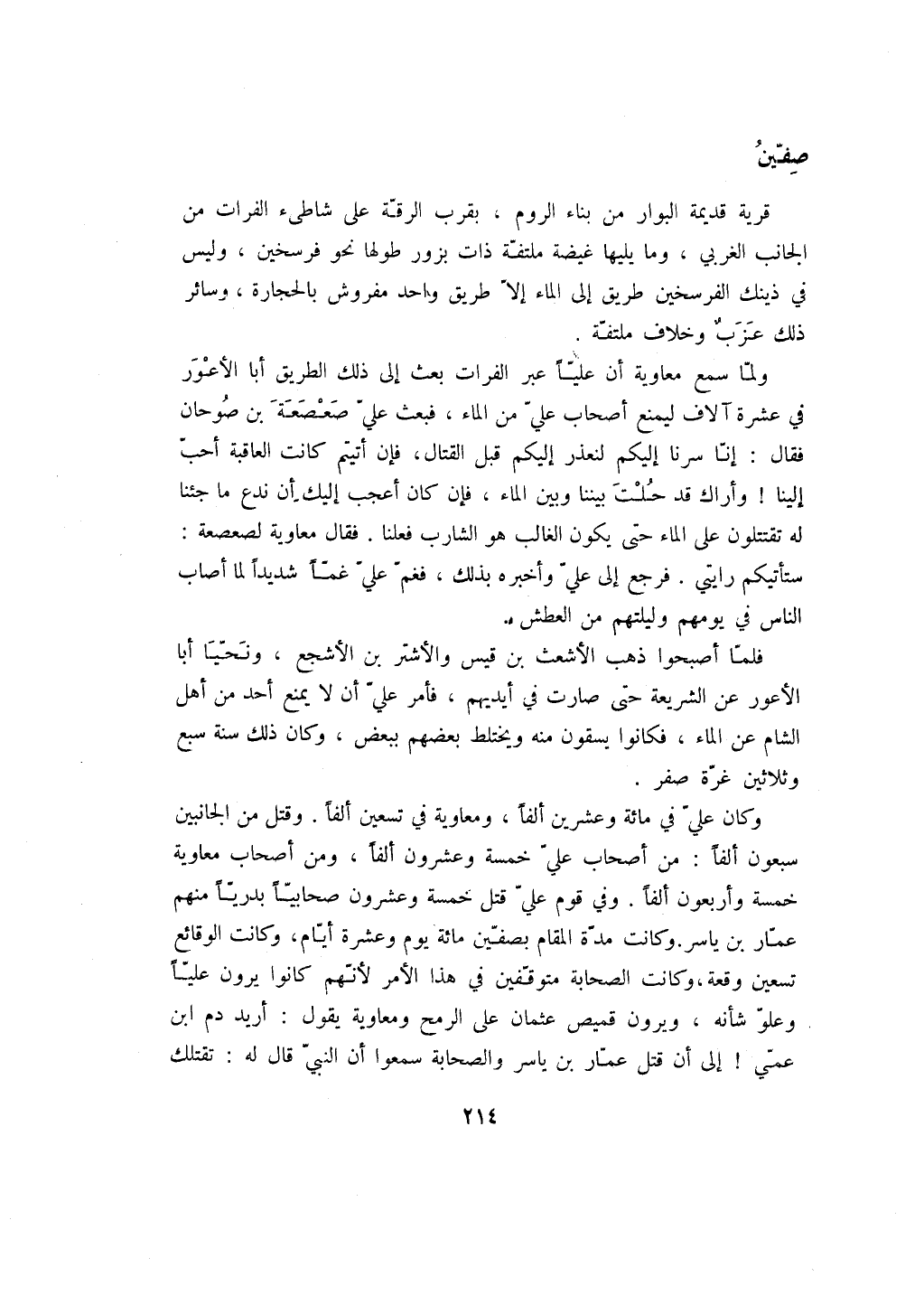 وكان علي في مائة وعشرين ألفاً، ومعاوية في تسعين ألفاً. وقتل من الجانبين سبعون ألفاً: من أصحاب علي خمسة وعشرون ألفاً، ومن أصحاب معاوية خمسة وأربعون ألفاً. وفي قوم علي قتل خمسة وعشرون صحابياً بدرياً منهم عمار بن ياسر. وكانت مدة المقام بصفين مائة يوم وعشرة أيام، وكانت الوقائع تسعين وقعة، وكانت الصحابة متوقفين في هذا الأمر لأنهم كانوا يرون علياً وعلو شأنه، ويرون قميص عثمان على الرمح ومعاوية يقول: أريد دم ابن عمي! إلى أن قتل عمار بن ياسر والصحابة سمعوا أن النبي قال له: تقتلك